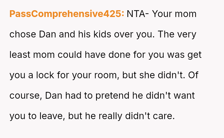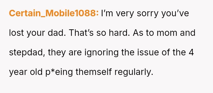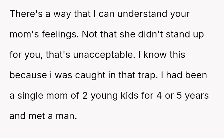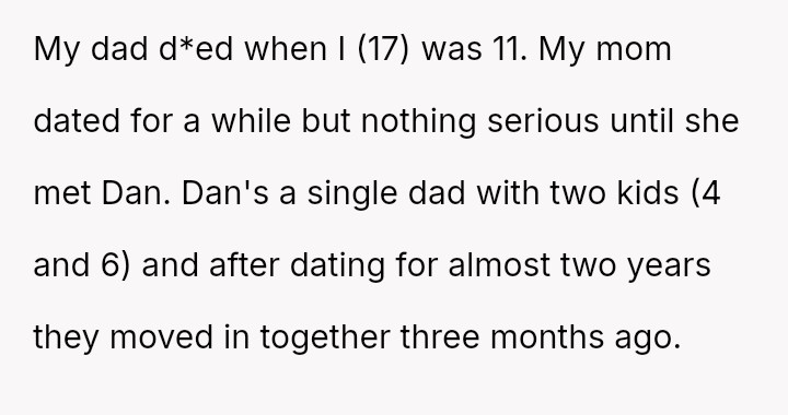 The original poster (OP), who was 17 when their father pa*sed away at age 11, discusses their mother's serious relationship with Dan, a single father of two young children (ages 4 and 6).