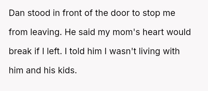 Feeling disrespected and enraged, the OP decided to leave, only to be physically blocked from exiting by Dan, who claimed the OP leaving would devastate the mother.