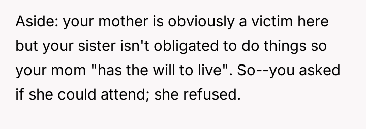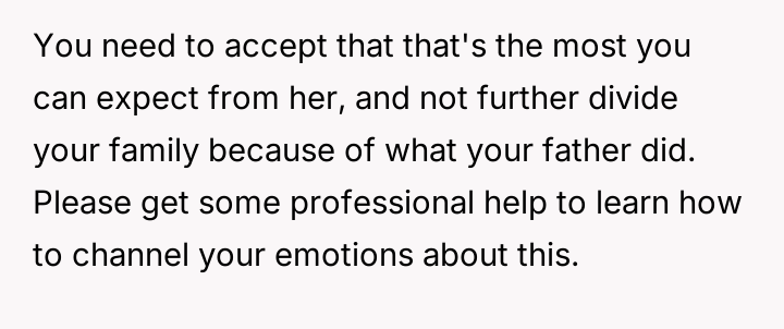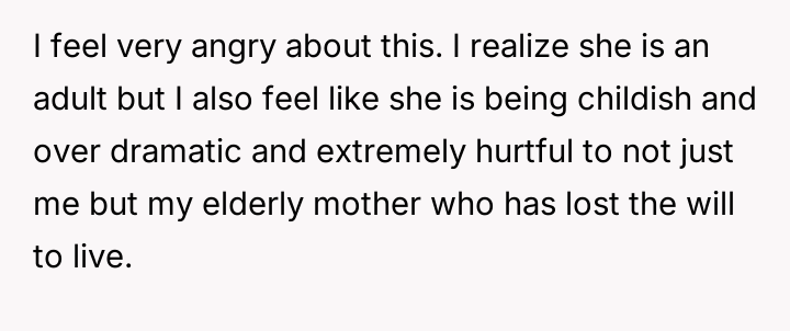 The original poster (OP) is deeply conflicted, feeling anger and a sense of betrayal because their sister refuses to attend their father's funeral, despite the OP and their elderly mother requesting it.