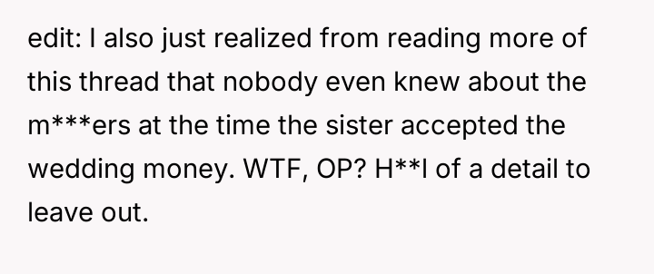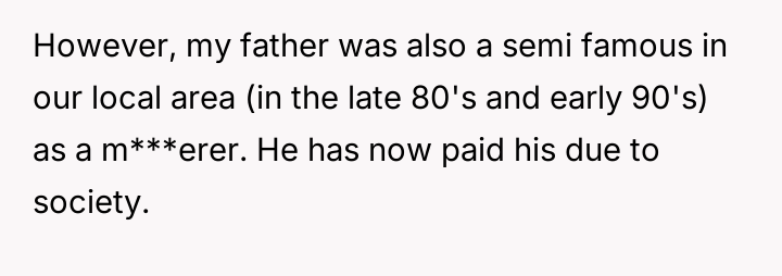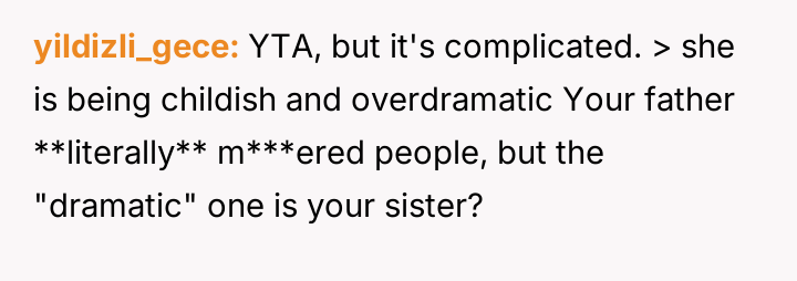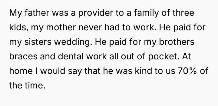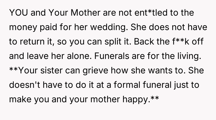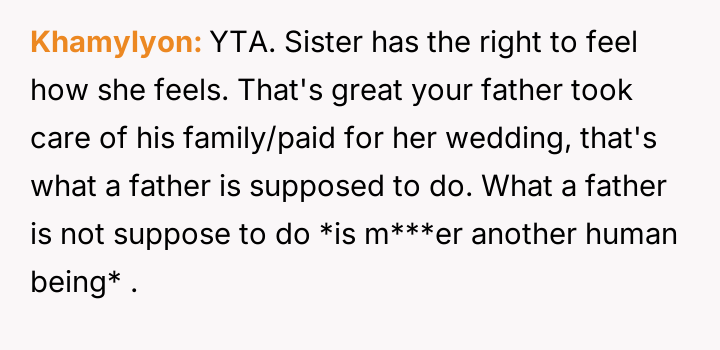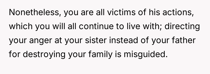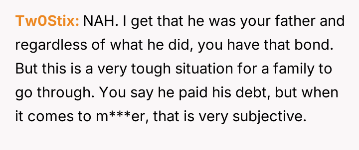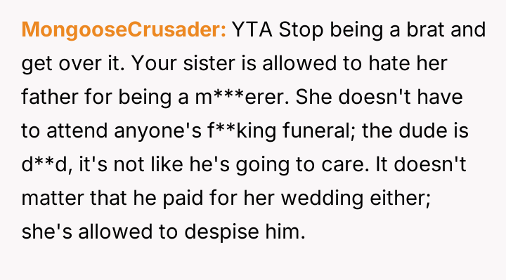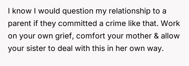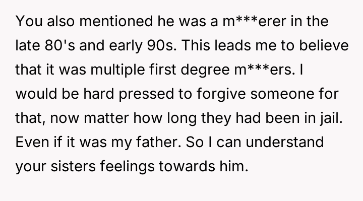 The conflict centers on whether the sister is justified in rejecting the father due to his past as a m***erer, even while benefiting financially from his provision, versus the OP's belief that this stance is childish and deeply hurtful during a time of shared grief.