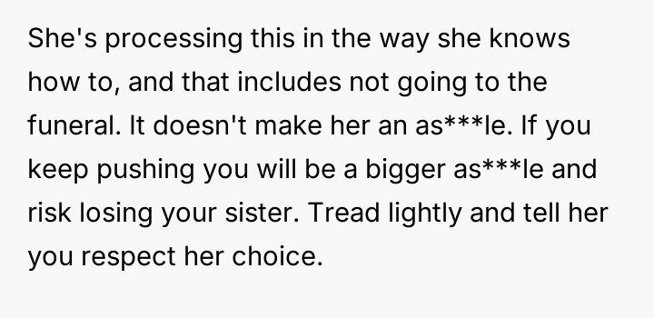 Is the sister ethically obligated to attend the funeral to support her grieving mother and brother, or does her right to define her relationship with her deceased father—based on his criminal history—outweigh the immediate emotional needs of her family?