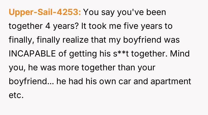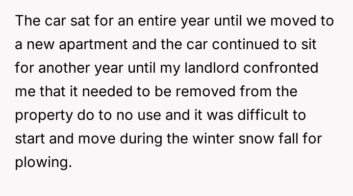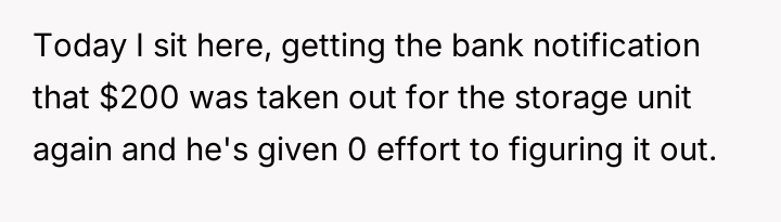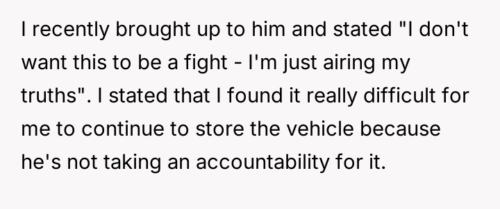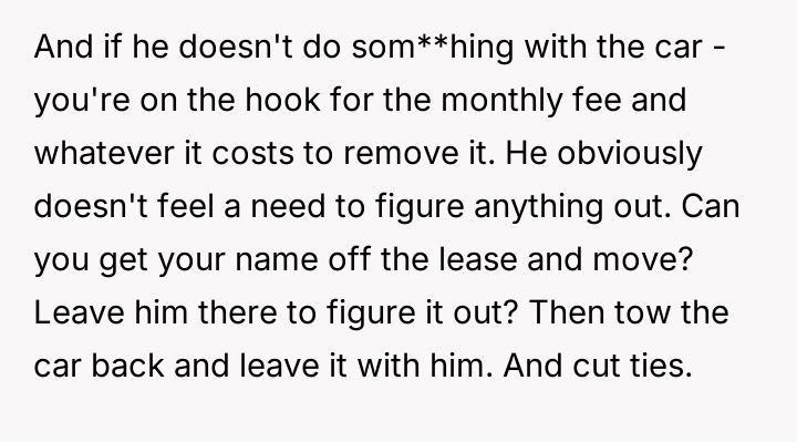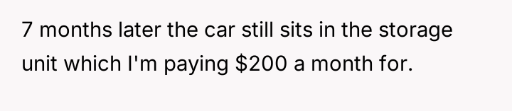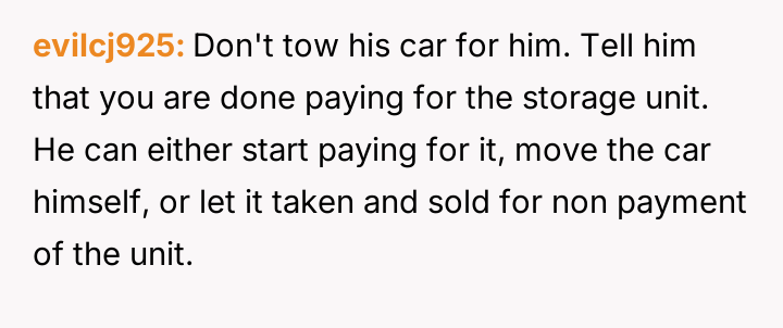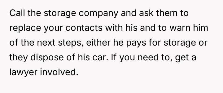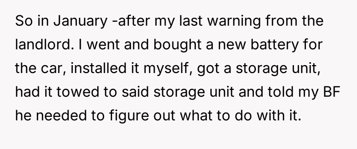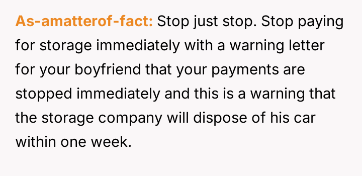 Given that the boyfriend has shown no initiative to resolve the storage issue after seven months, should the OP immediately cease paying for the storage and take unilateral action (like towing the car to his mother's house) to force a resolution, or does she have an obligation to have one final, direct conversation es**blishing a strict d**dline before enacting such measures?