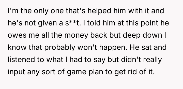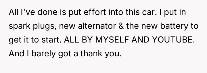 Her efforts to fix what was broken—buying a new battery, trying to keep peace—felt like a lonely battle against his stubbornness and denial.