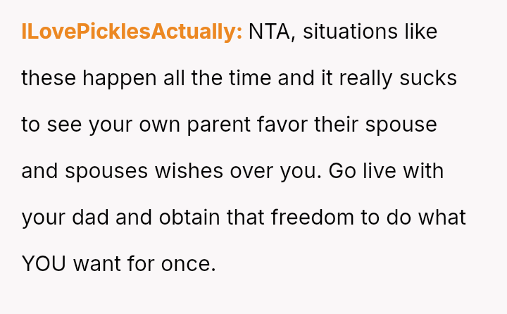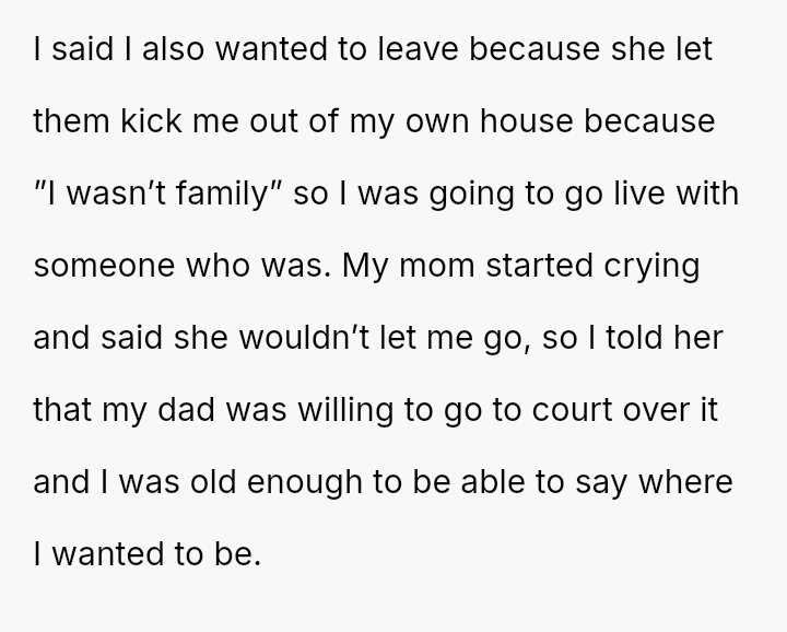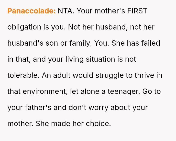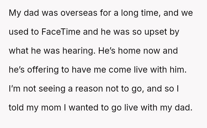 Considering the es**blished pattern of neglect and sacrifice forced upon the OP, is her action to legally pursue living with her father an appropriate act of self-preservation, or is she being unfair by causing extreme emotional and legal disruption for her mother and step-father?