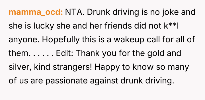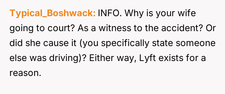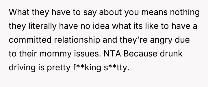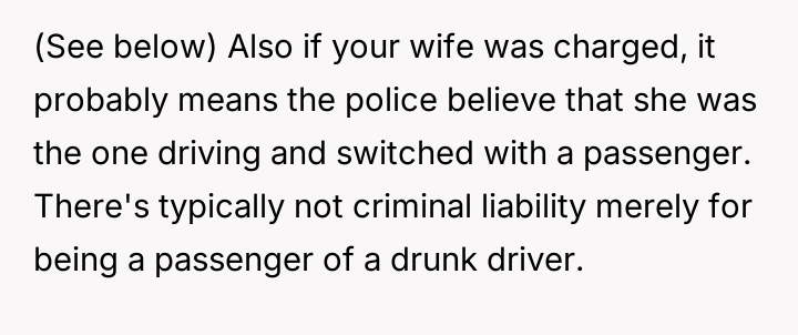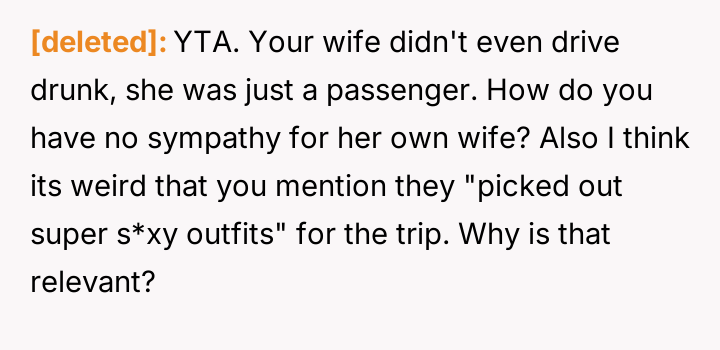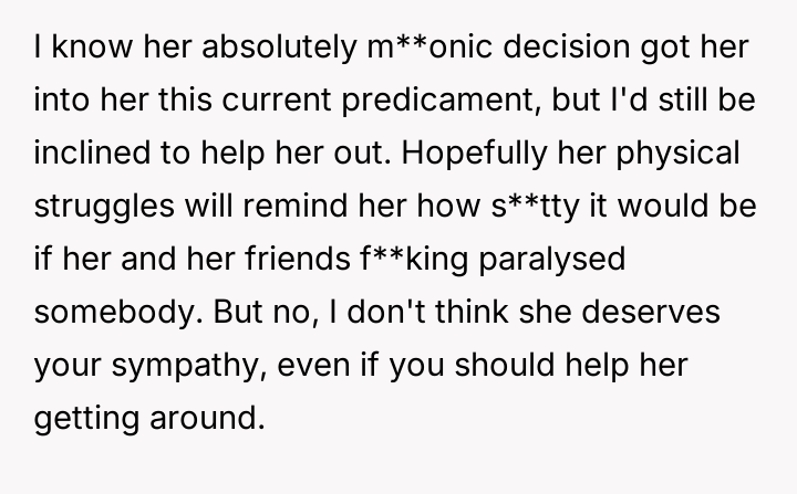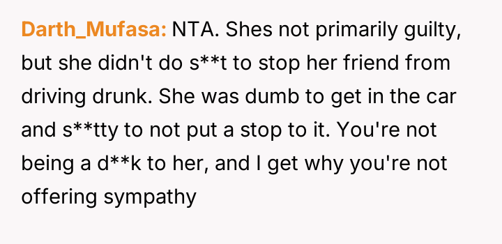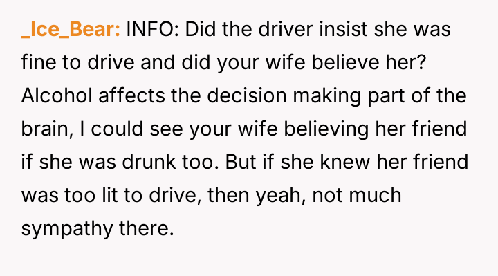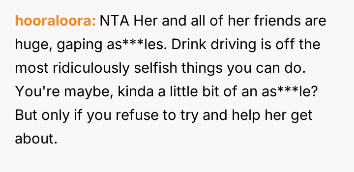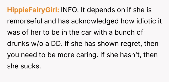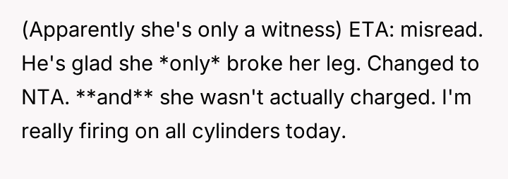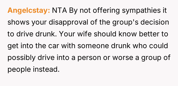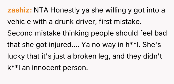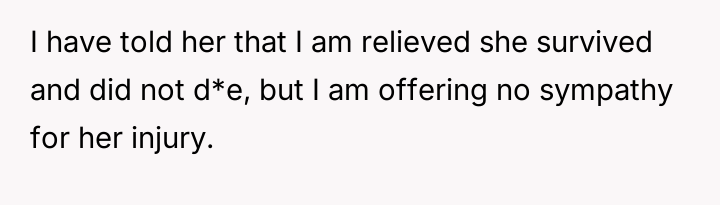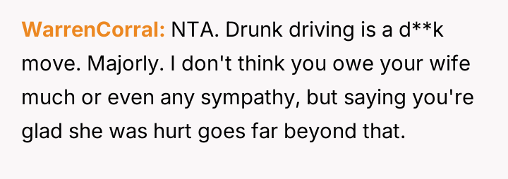 The original poster is experiencing a deep conflict between his relief that his wife survived a serious accident and his refusal to offer sympathy for her resulting broken leg, stemming from his judgment regarding her drunk driving.