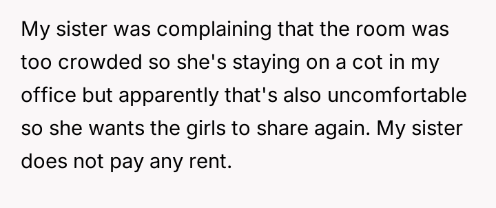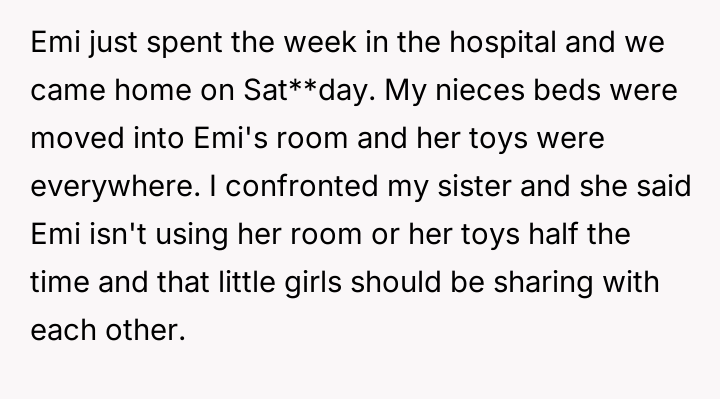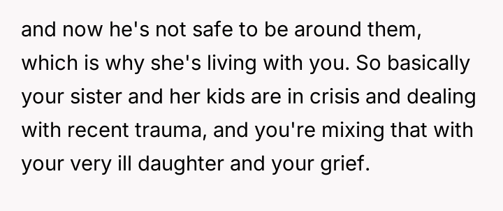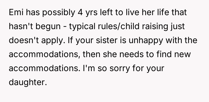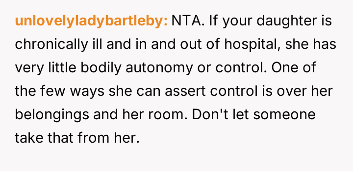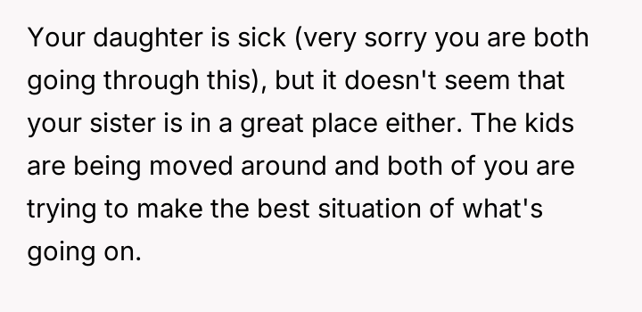 The original poster (OP) faced a significant conflict between defending her critically ill daughter's deeply held need for personal space and control over her few possessions, and the expectations of her temporarily housing sister regarding shared living arrangements.