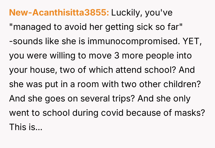The core debate centers on prioritizing the specific, fragile needs of a sick child against the practical demands of temporary family cohabitation.