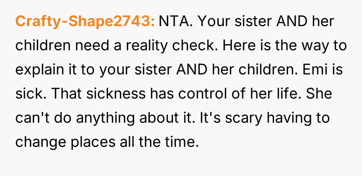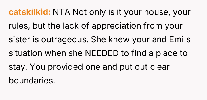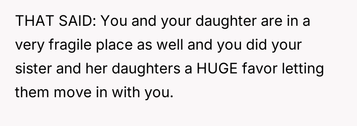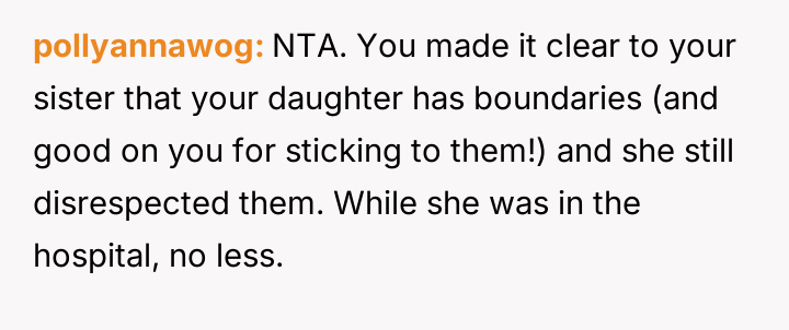 The OP prioritized her daughter's emotional comfort and es**blished boundaries, resulting in a harsh ultimatum given to her sister.