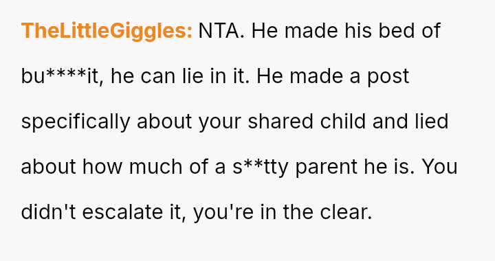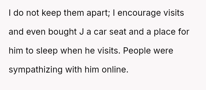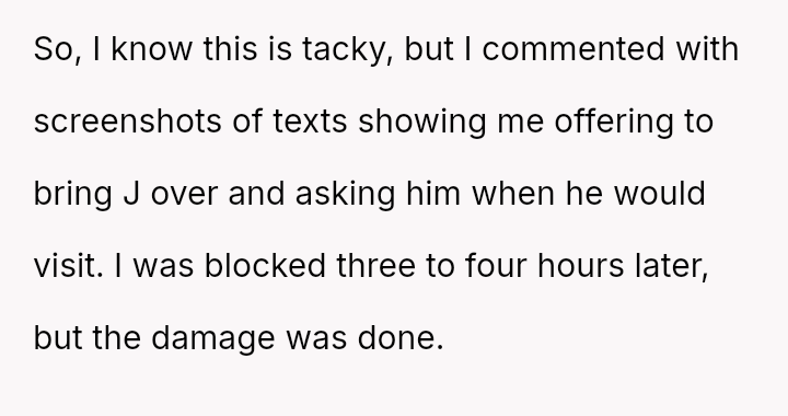 The OP acted defensively by exposing text messages that demonstrated their attempts to facilitate contact, leading to immediate backlash from the ex-partner and a friend.