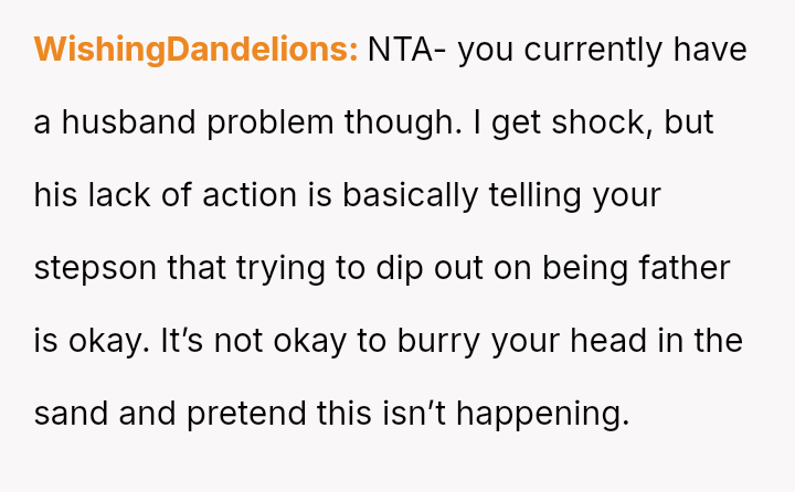 The original poster (OP) took a firm and highly involved stance against her stepson's attempt to evade responsibility for his girlfriend's pregnancy.