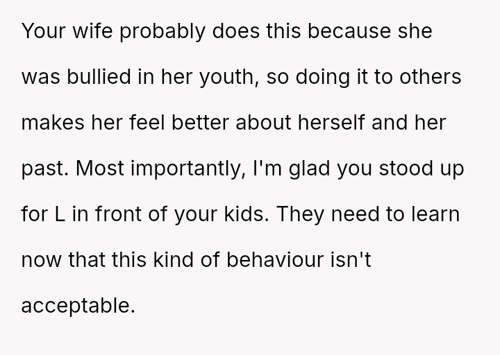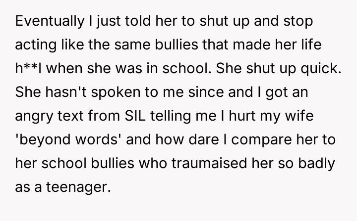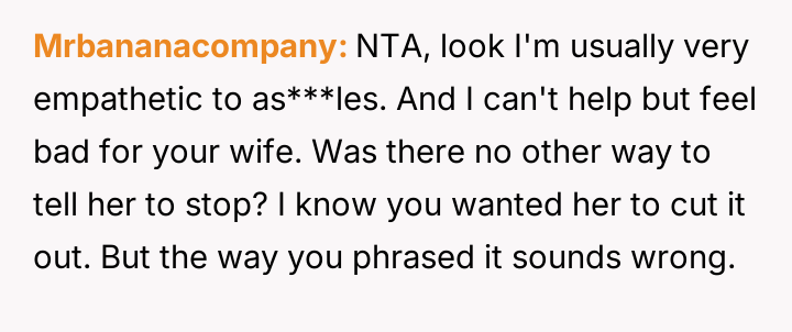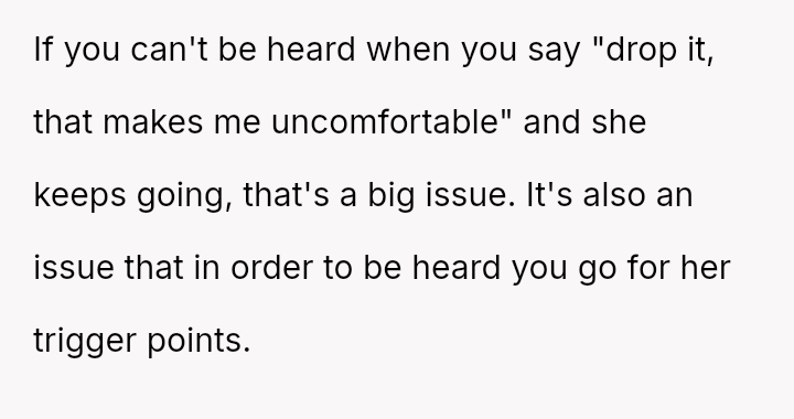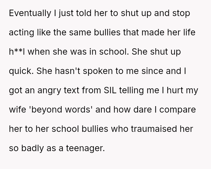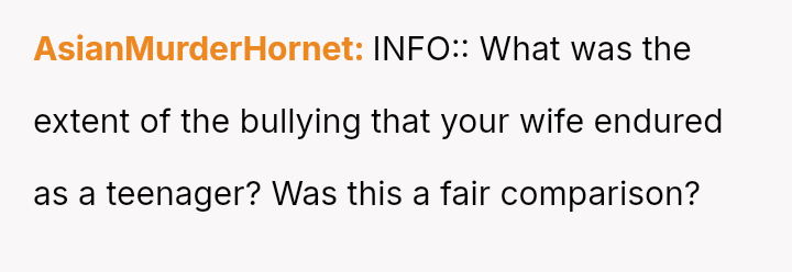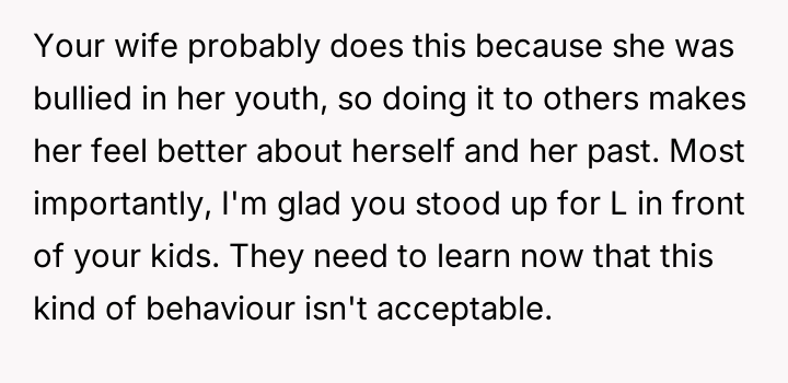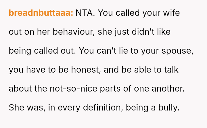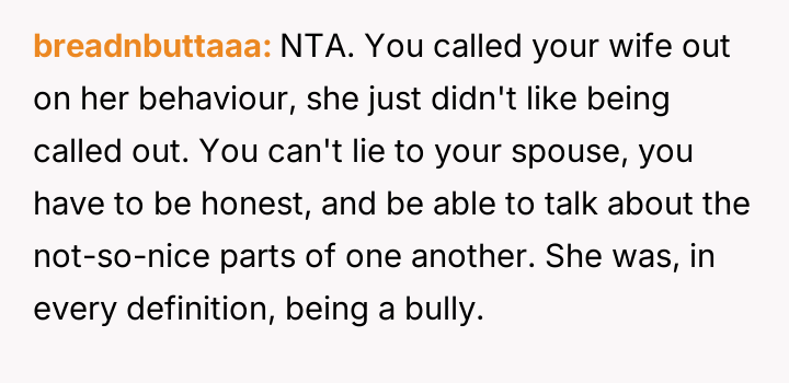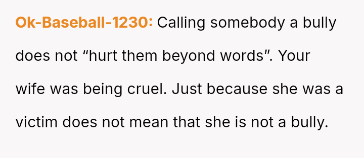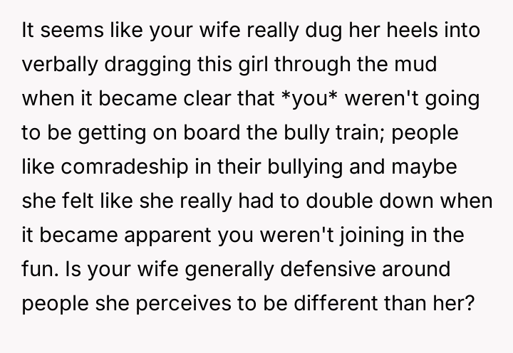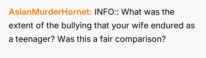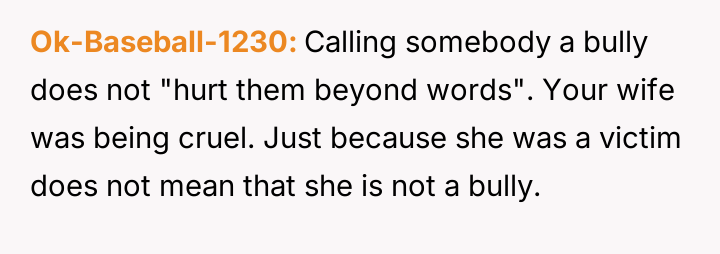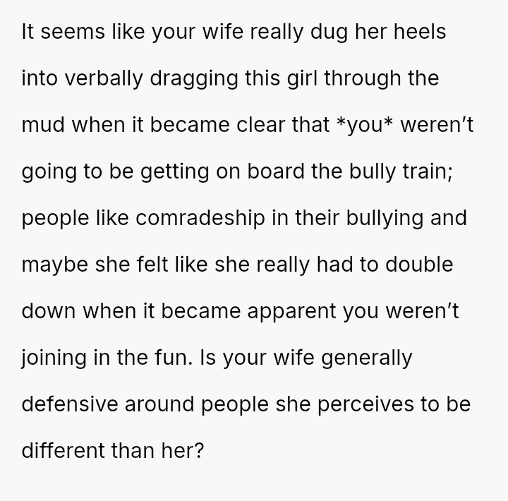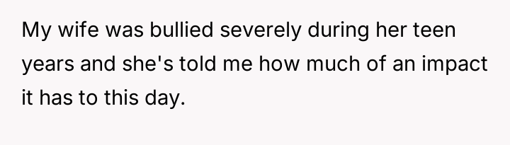 Was the husband justified in using the painful memory of his wife's bullying history against her to stop an inappropriate public judgment, or did invoking her trauma cross a necessary boundary in their relationship?