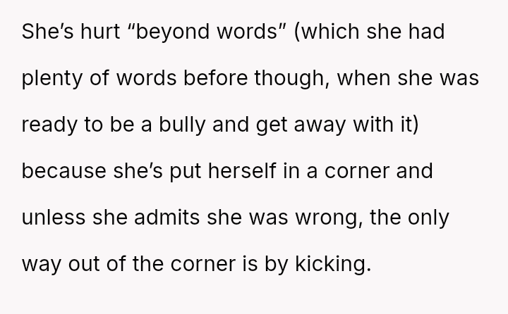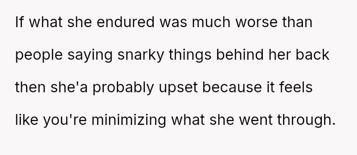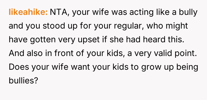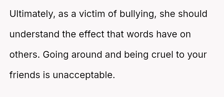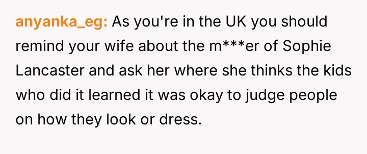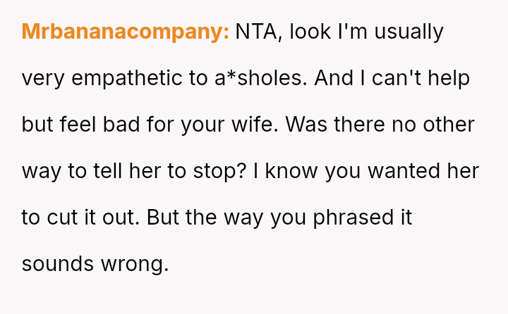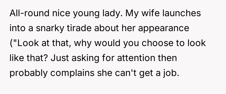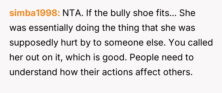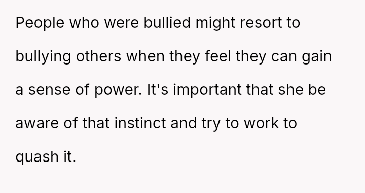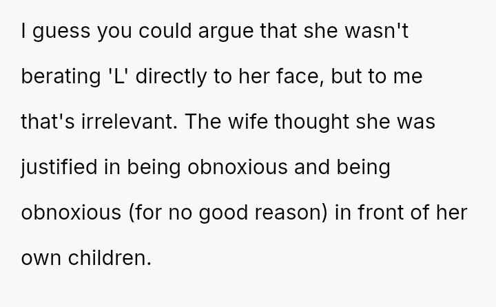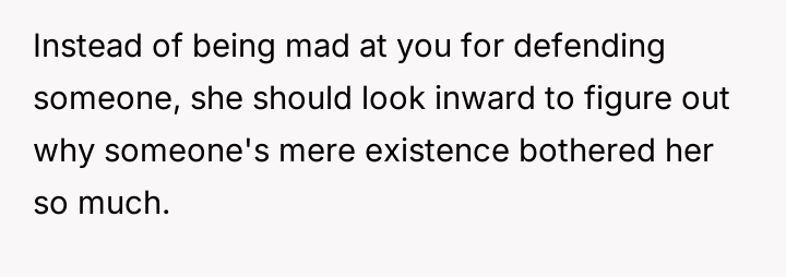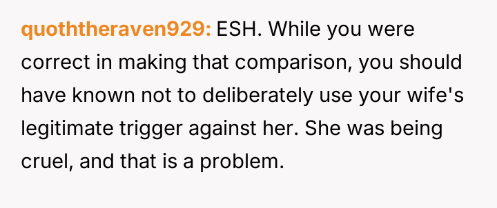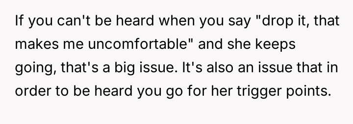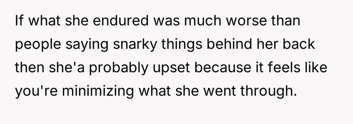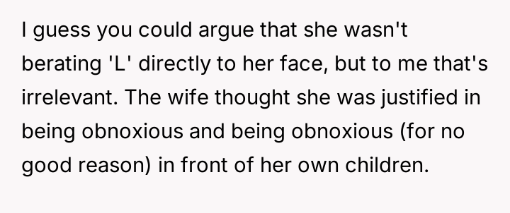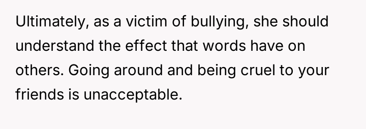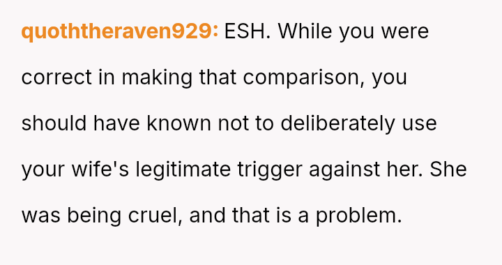 Was the husband justified in using the painful memory of his wife's bullying history against her to stop an inappropriate public judgment, or did invoking her trauma cross a necessary boundary in their relationship?