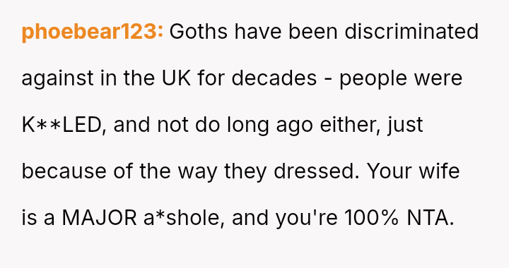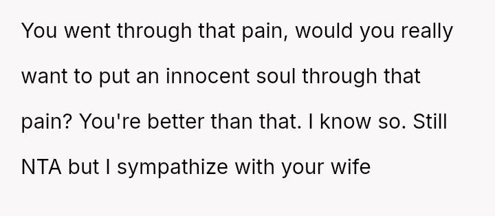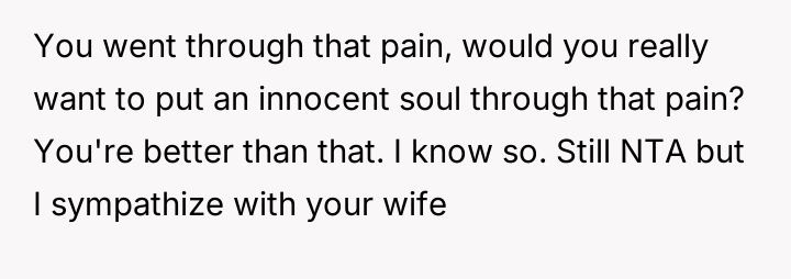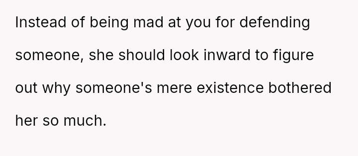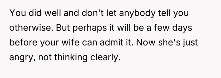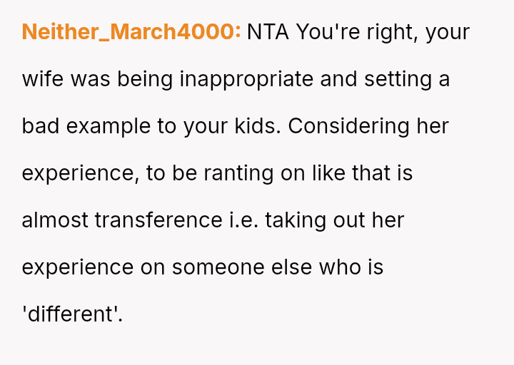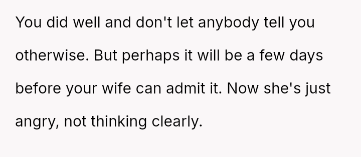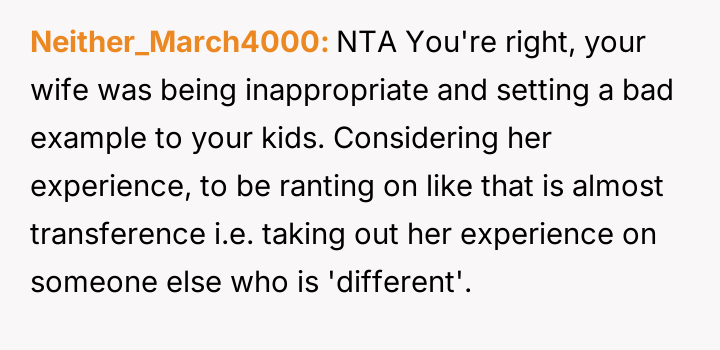 The husband found himself in a severe conflict between defending a stranger from his wife's harsh judgment and acknowledging his wife's past trauma from bullying.