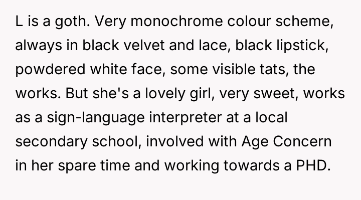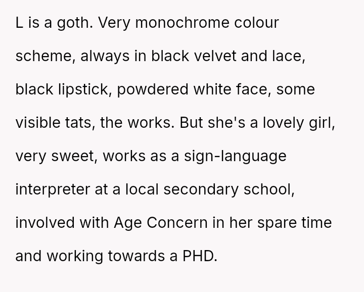 Among his regulars was L, a striking woman cloaked in gothic elegance, her appearance a sharp contrast to the mundane setting, yet her kindness and warmth shone through like a beacon.