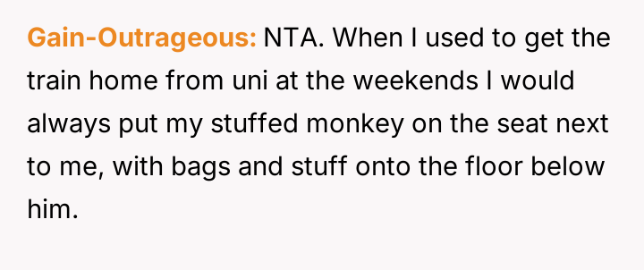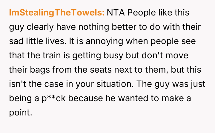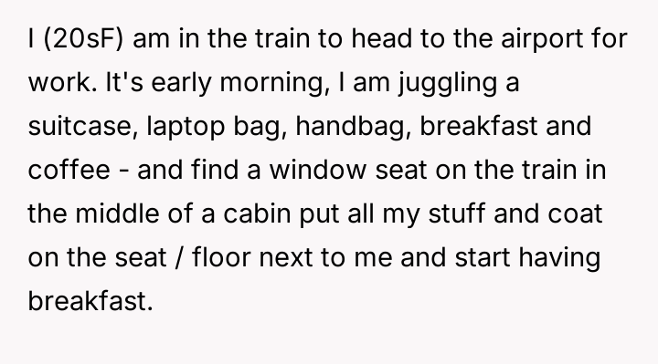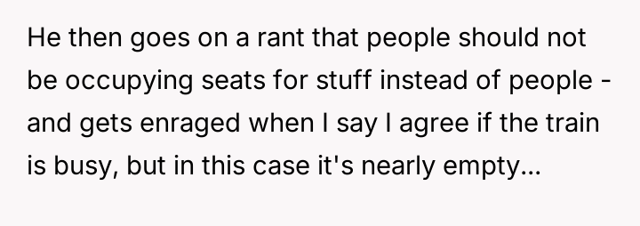 Was the OP justified in reserving space for their belongings when the train was not full, or was the male passenger correct in demanding the seat immediately based on a principle that people should take precedence over property in shared spaces?