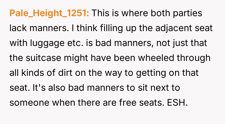 The original poster (OP) prioritized their immediate need for comfort and space to manage their belongings while traveling lightly occupied, leading to a direct confrontation with another passenger who prioritized an es**blished social etiquette regarding seat occupancy.