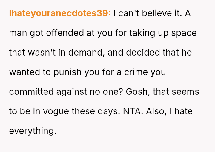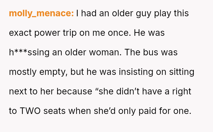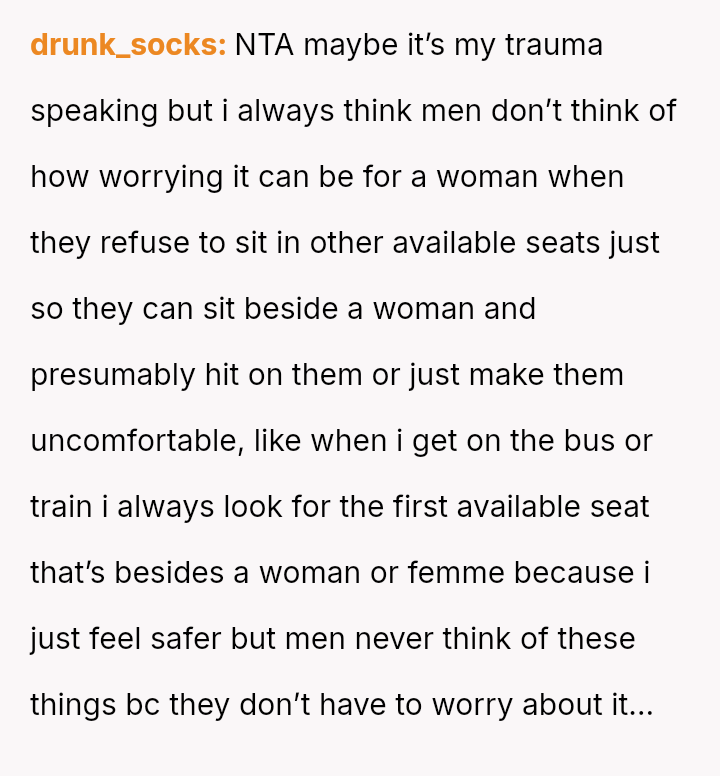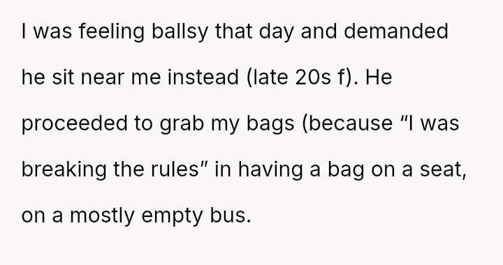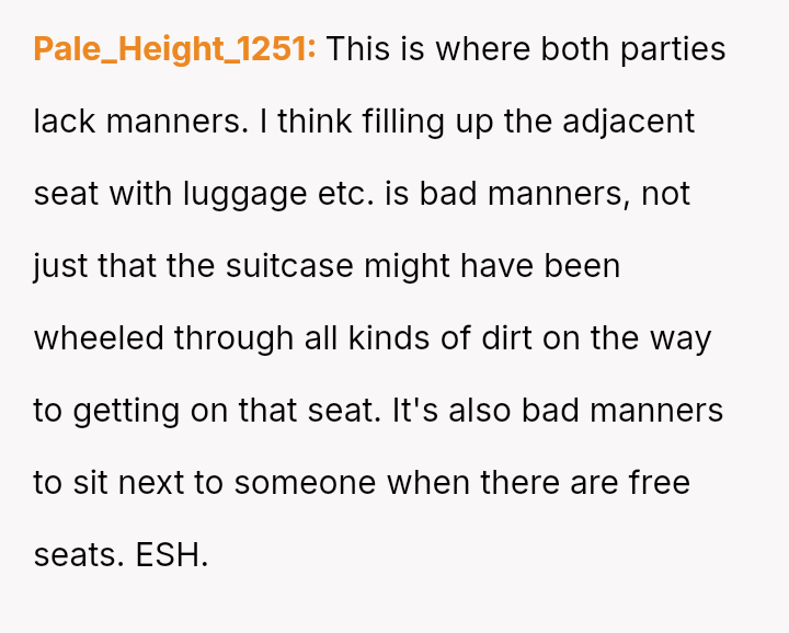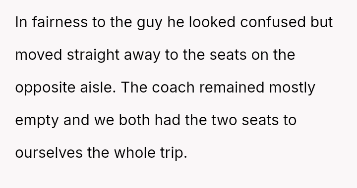 The original poster (OP) prioritized their immediate need for comfort and space to manage their belongings while traveling lightly occupied, leading to a direct confrontation with another pa*senger who prioritized an es**blished social etiquette regarding seat occupancy.