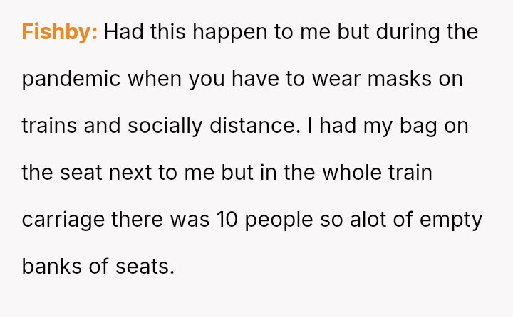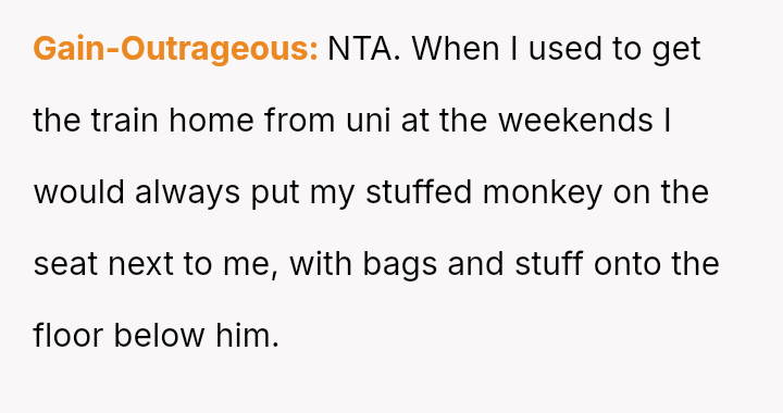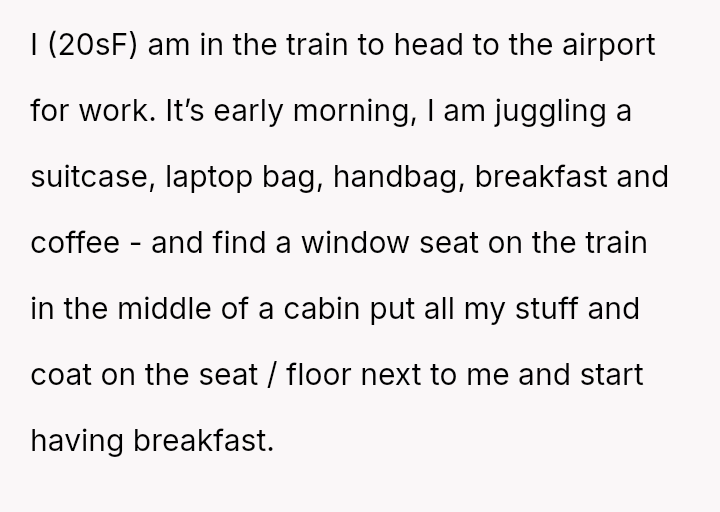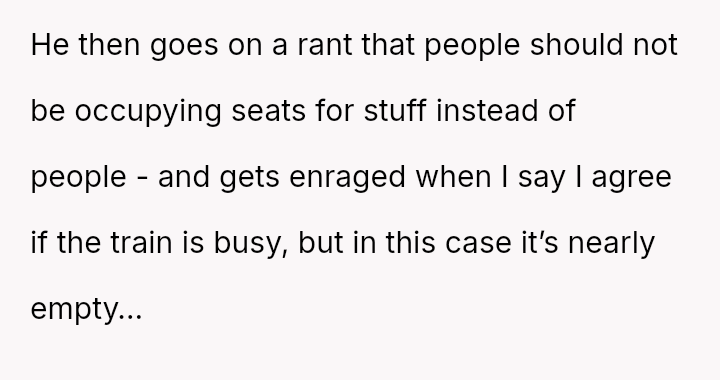 Was the OP justified in reserving space for their belongings when the train was not full, or was the male pa*senger correct in demanding the seat immediately based on a principle that people should take precedence over property in shared spaces?