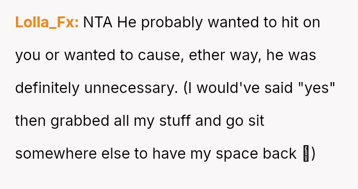 The central conflict stems from a difference in interpretation regarding acceptable personal space claims versus shared public courtesy when resources (seats) are plentiful.