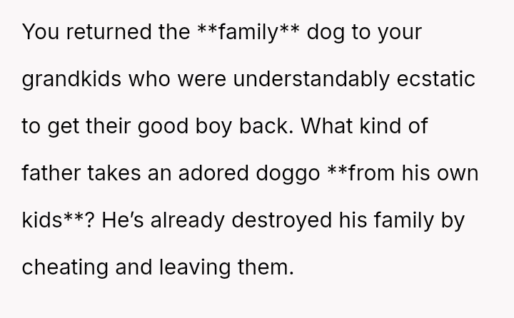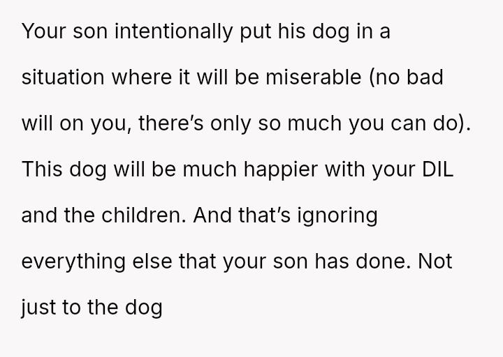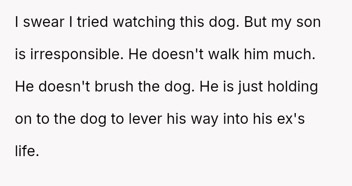 The original poster (OP) is faced with a difficult situation involving her adult son's marital failure and the resulting disruption to her home life, particularly concerning the care of his dog.