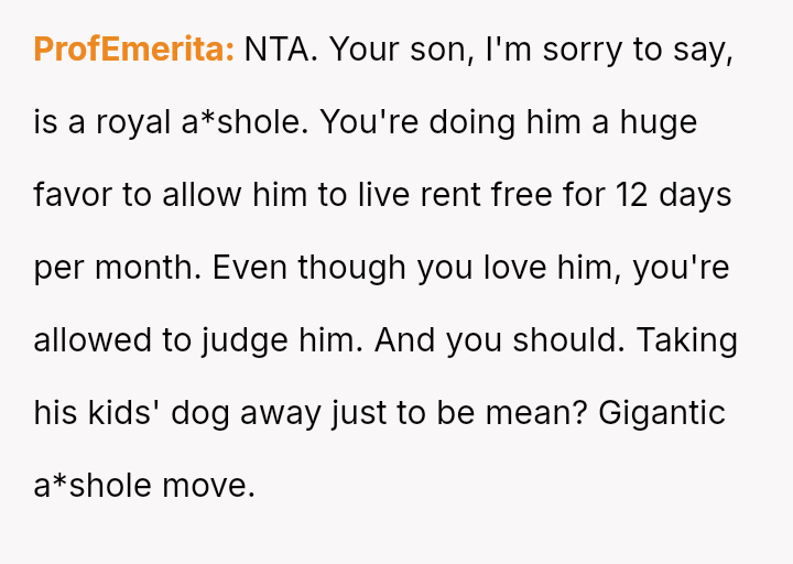 The core debate rests on whether a parent has the right to set strict conditions on the use of their home, even if it means removing an item the adult child values, especially when that item is being weaponized in a divorce.