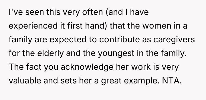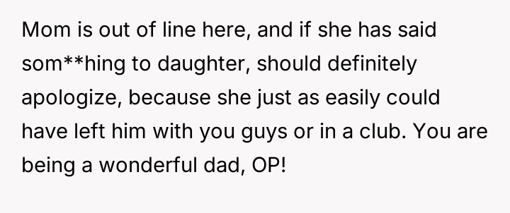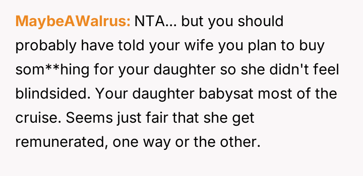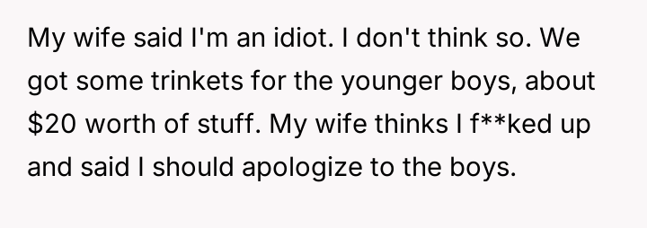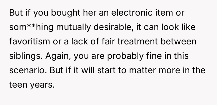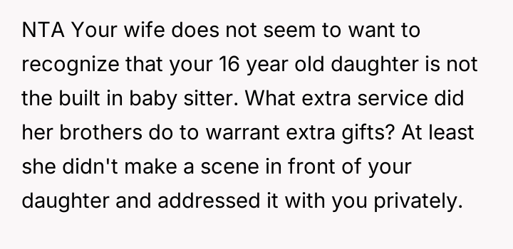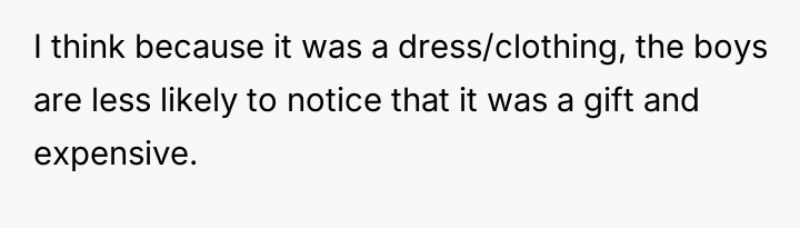 The father feels his gift was appropriate recognition for his daughter's maturity and kindness, while the mother views it as inappropriate favoritism that necessitates an apology to the sons.