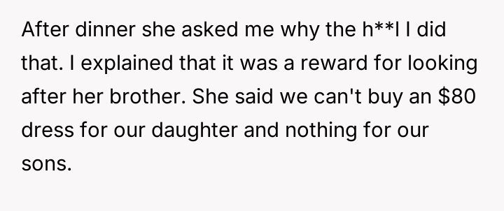 The core conflict centers on the father's decision to reward his 16-year-old daughter with an $80 dress for her willingness to include her younger brother in her vacation activities, contrasting with the mother's belief that this created an unfair disparity in gifts among the children.