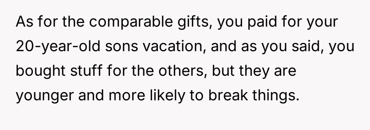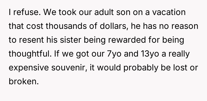 Given the differing views on appropriate recognition for acts of kindness versus the cost of a family vacation, is the father justified in refusing to apologize for rewarding his daughter's maturity, or does the creation of visible inequality in material rewards undermine the family's overall appreciation for all the children?