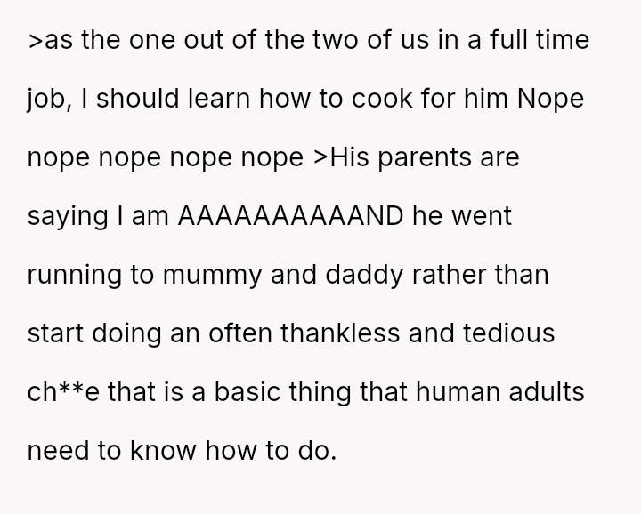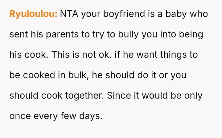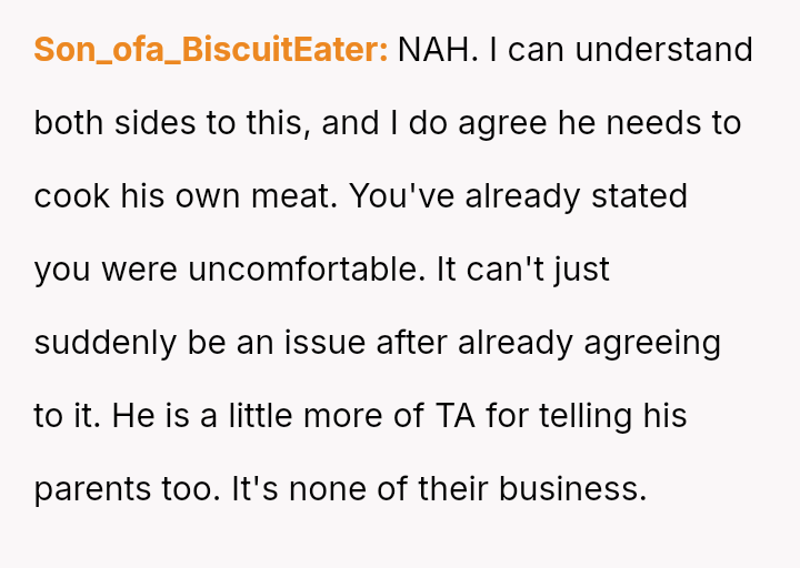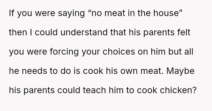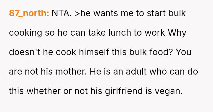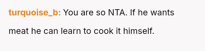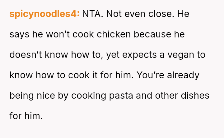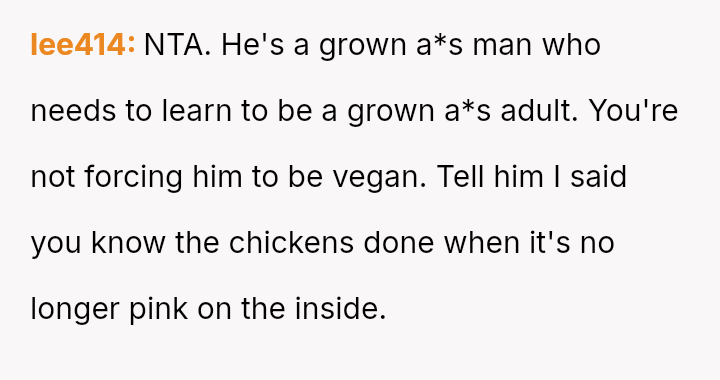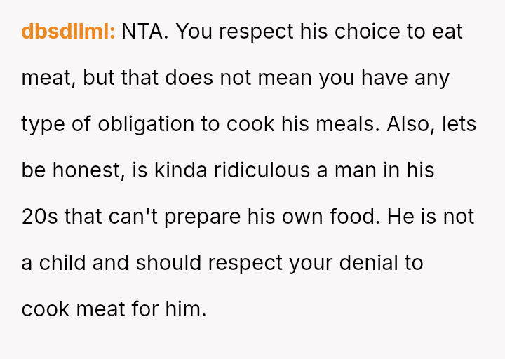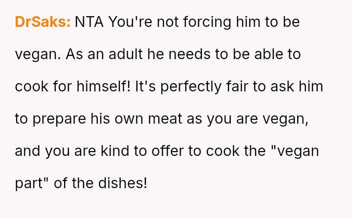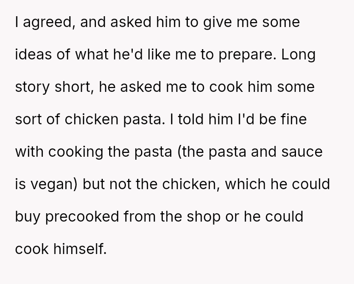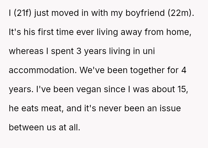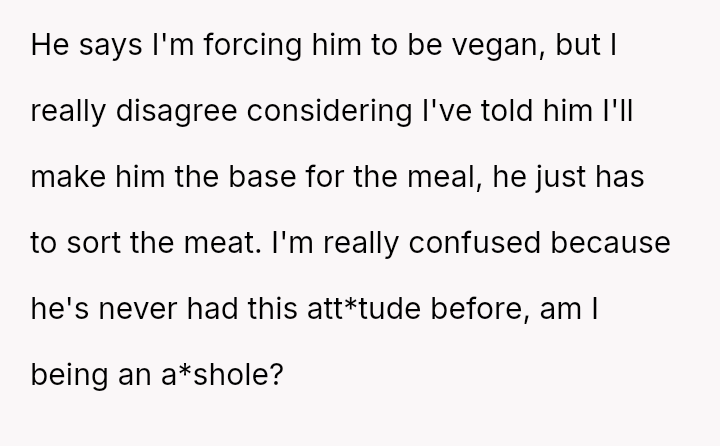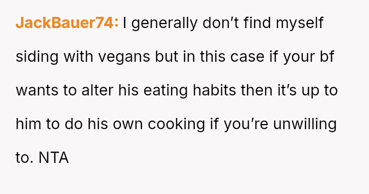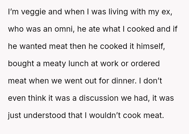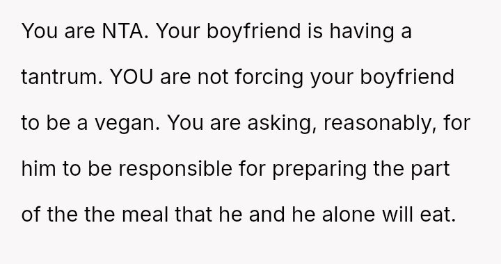 Given the es**blished history of respecting the OP's veganism in food preparation, is the boyfriend's demand that she cook meat for him a reasonable expectation in a shared living situation, or is the OP justified in maintaining her boundary regarding animal product preparation?