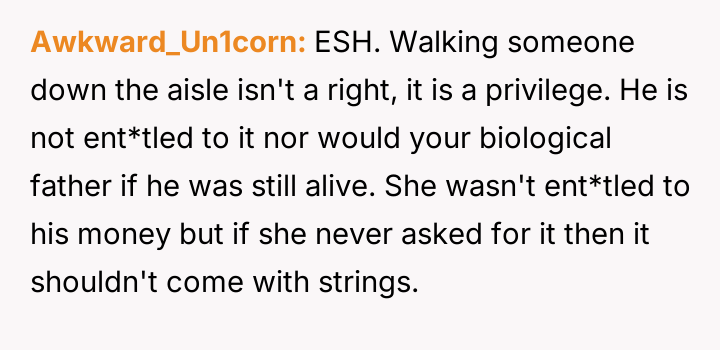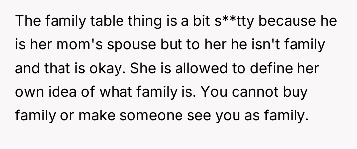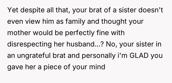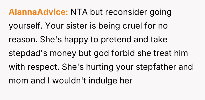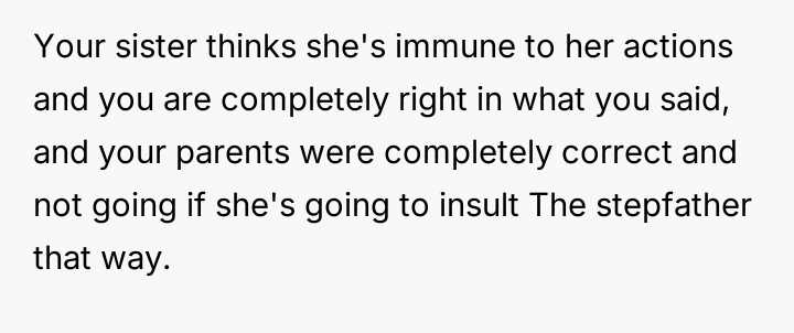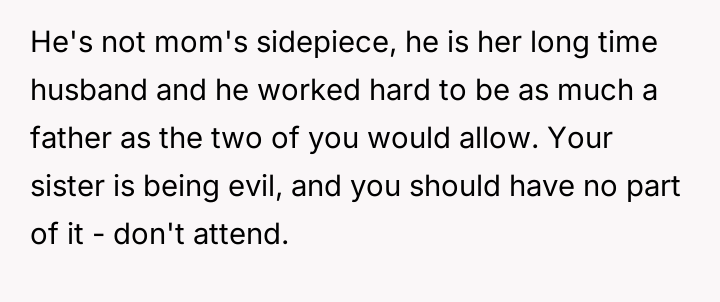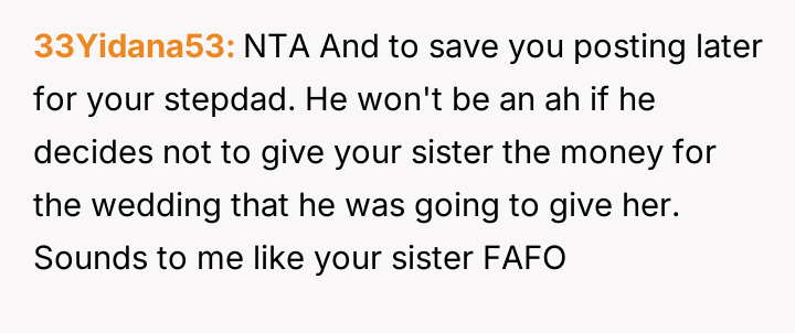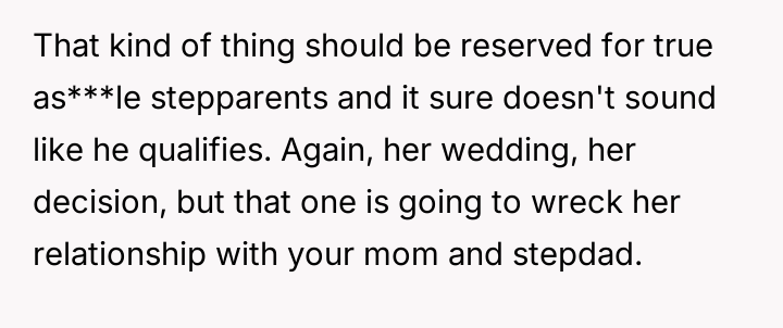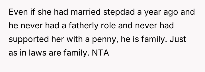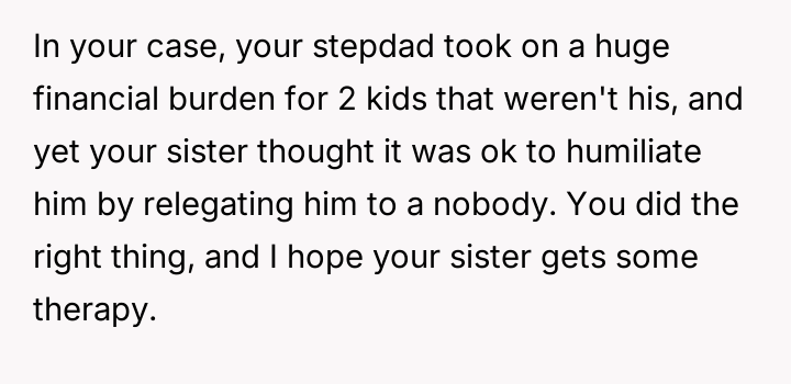 Given the sister's firm stance on defining who is 'family' for her wedding versus the stepfather's significant role in raising them and providing financial security, is the sister justified in setting these boundaries for her ceremony, or do the OP's accusations of immaturity accurately reflect a failure to acknowledge the stepfather's deep paternal commitment?