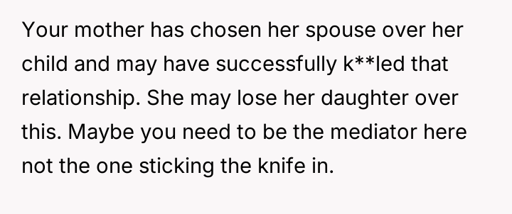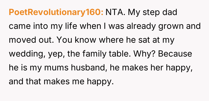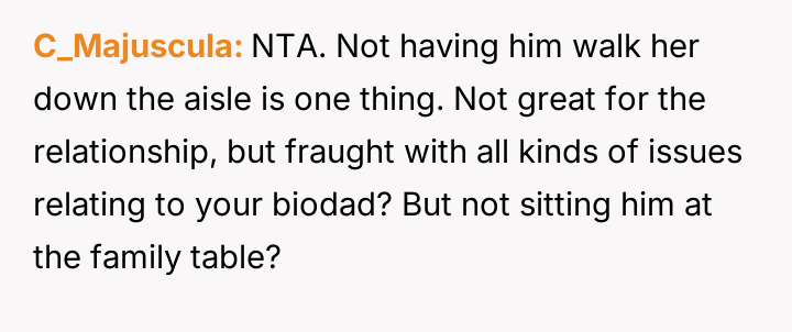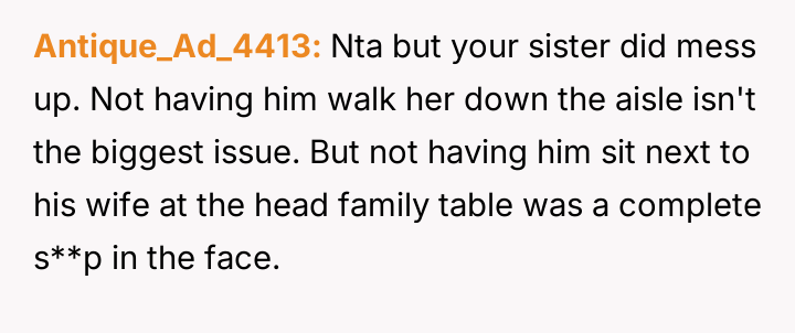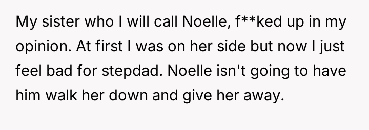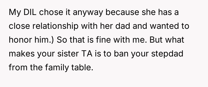 The original poster (OP) is experiencing deep conflict due to their sister's decision to exclude their stepfather from major wedding roles and the family table, a decision the OP initially supported but later condemned after realizing its emotional impact on the parents.
