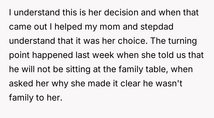 The narrator watches helplessly as their stepdad, a man who shaped their childhood and carried their burdens, is pushed to the margins—left without the honor of a place at the family table or the warmth of belonging.