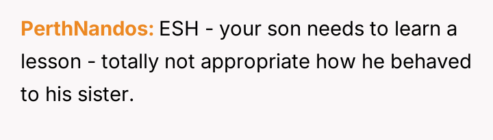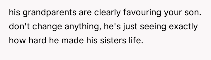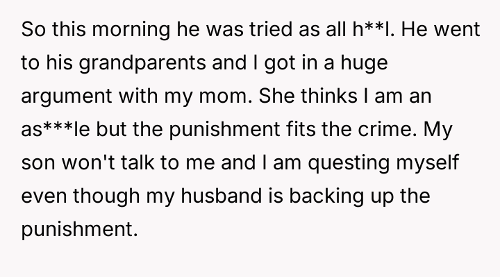 While the OP stands by the fairness of the punishment fitting the severity of the initial action, the son is clearly resentful, and the grandmother strongly disagrees with the OP's disciplinary approach.
