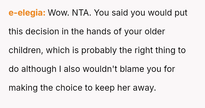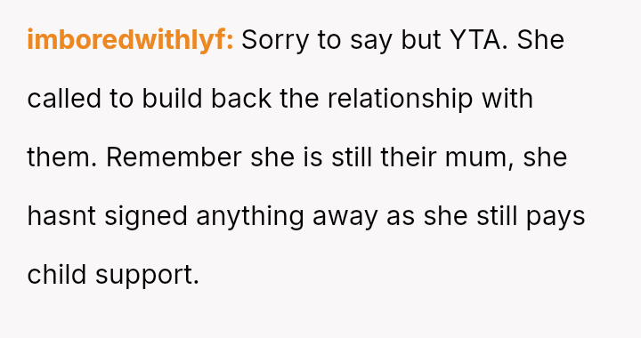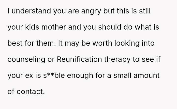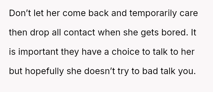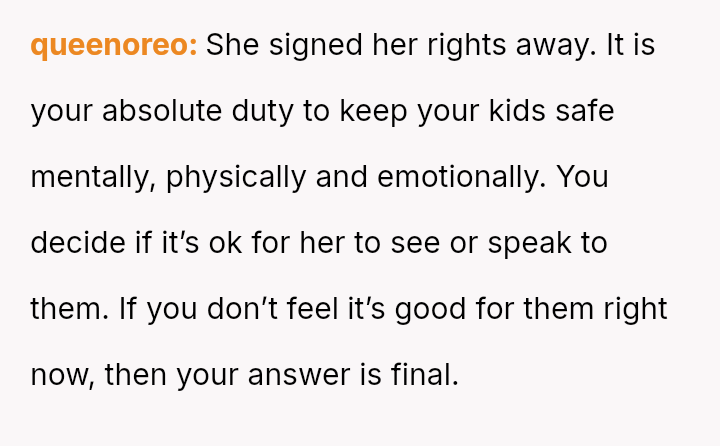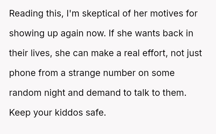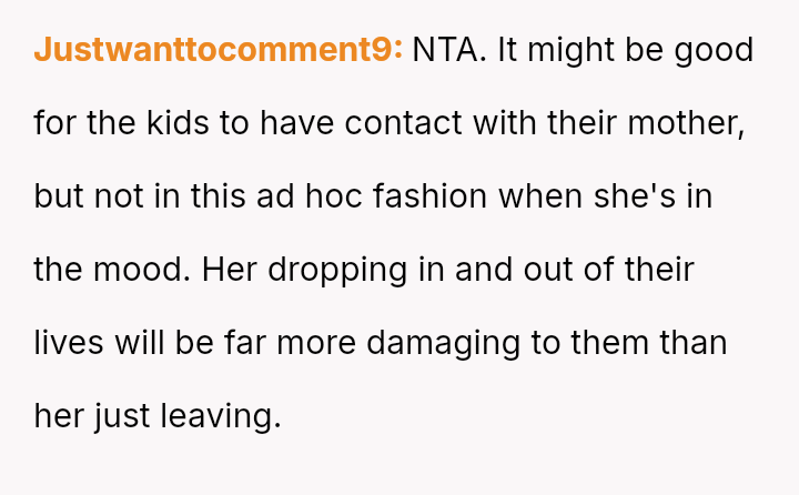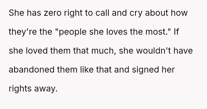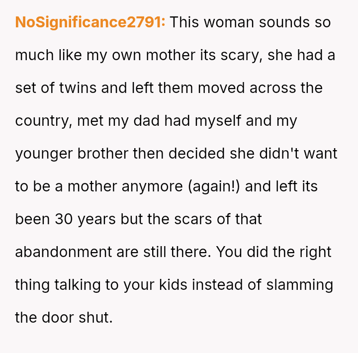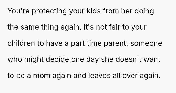 Given the mother's voluntary absence and the differing levels of understanding among the children regarding the abandonment, is the father justified in unilaterally blocking all contact to prioritize his children's current emotional s**bility, or does the mother's status as their biological parent necessitate a mediated pathway for communication, regardless of past actions?