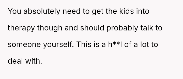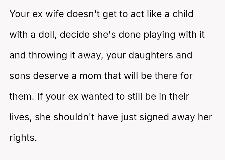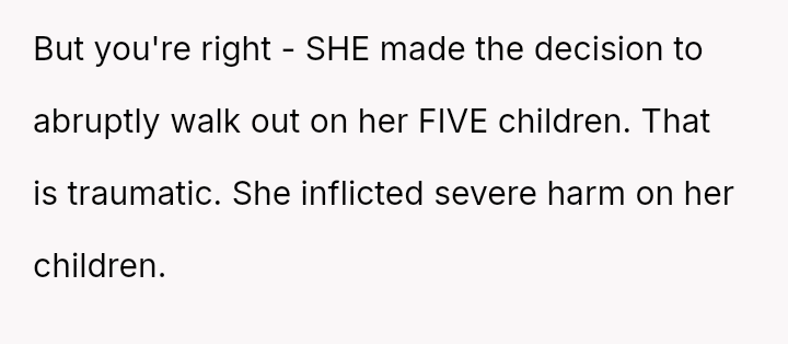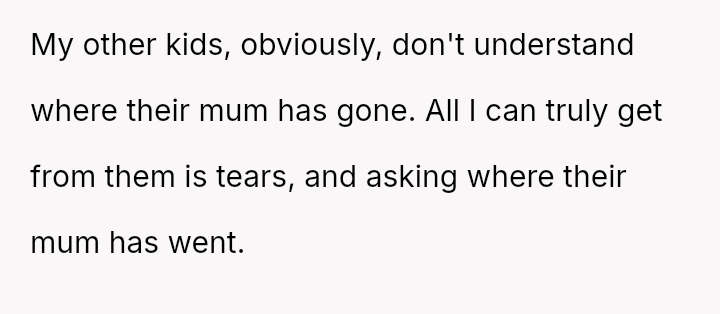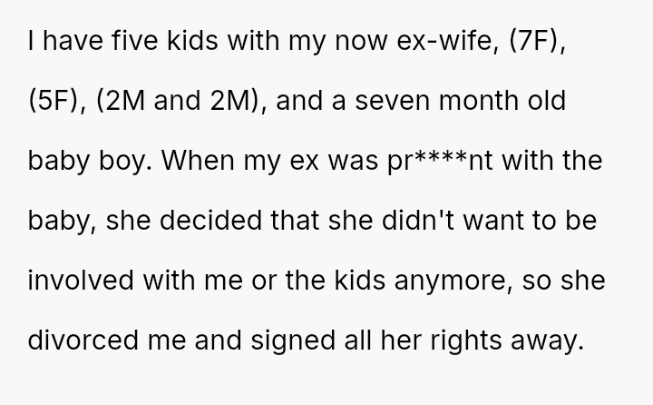 The original poster (OP) is clearly experiencing significant emotional strain from managing the abandonment trauma of five children following their ex-wife's sudden departure and legal surrender of parental rights.