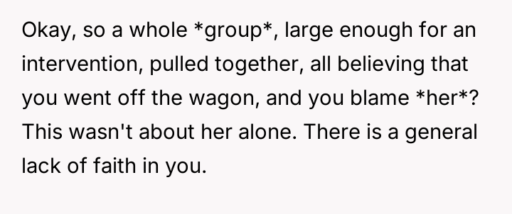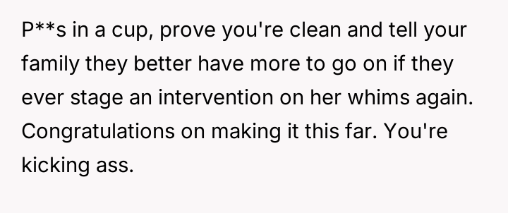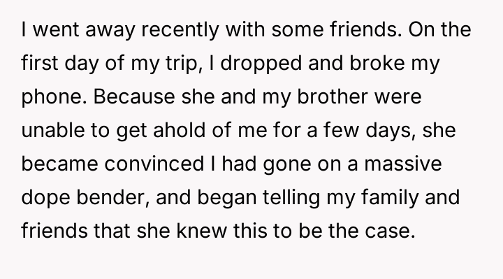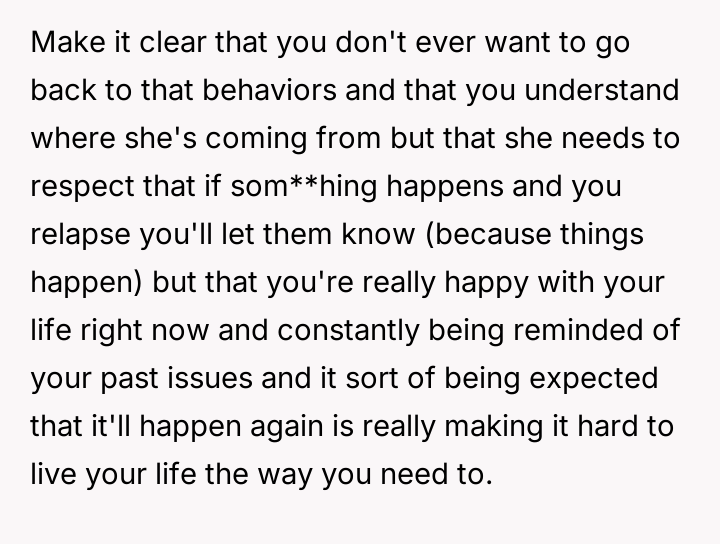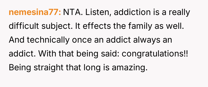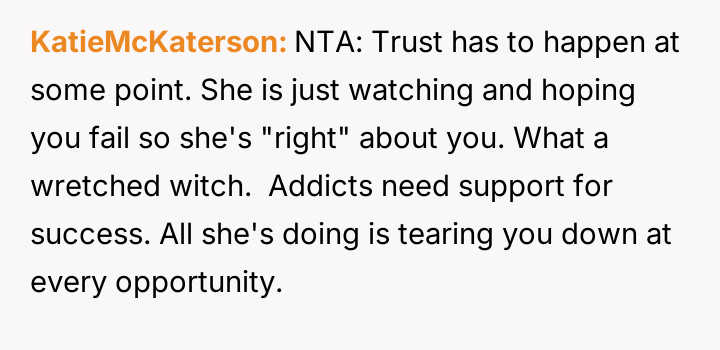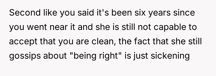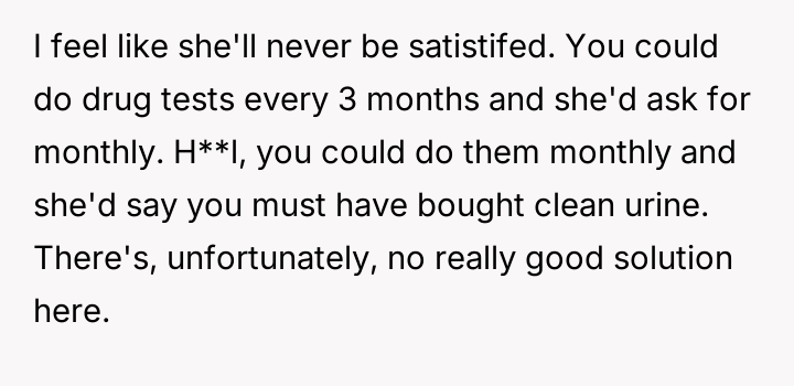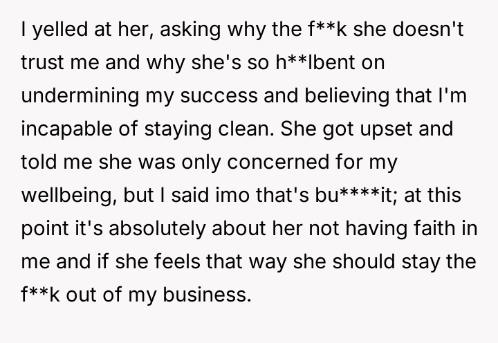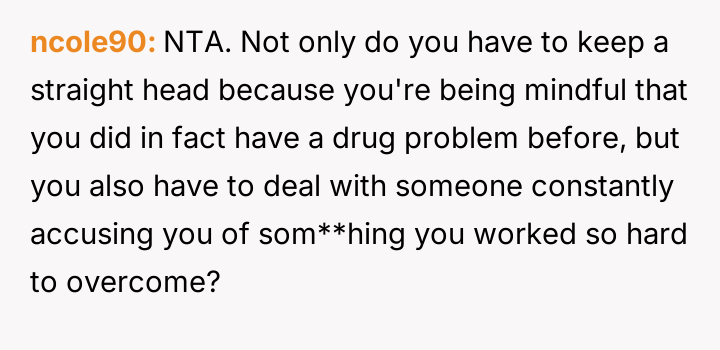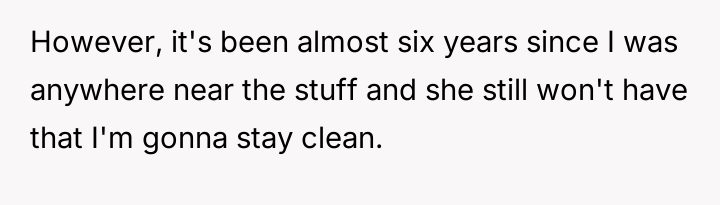 The OP feels his long-term commitment to staying clean is being undermined by her refusal to accept his recovery, culminating in an explosive confrontation after she falsely accused him of relapsing during a phone outage.
