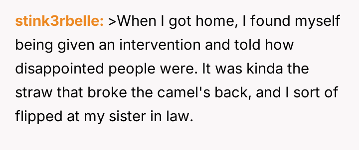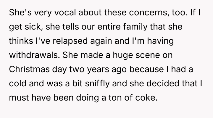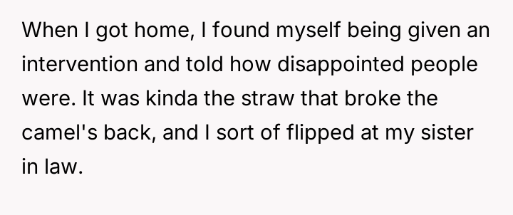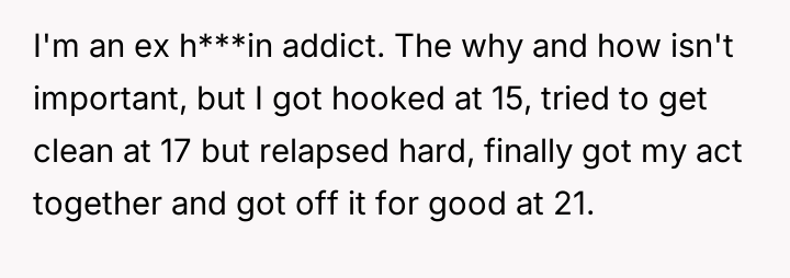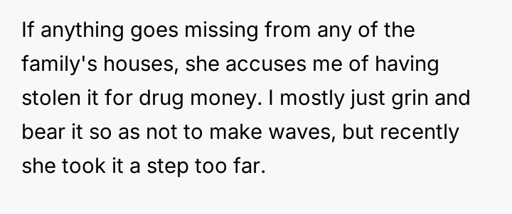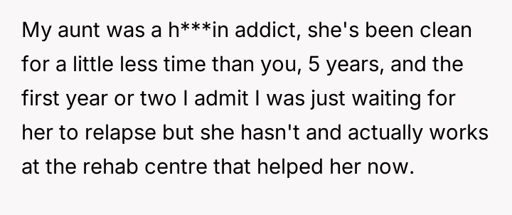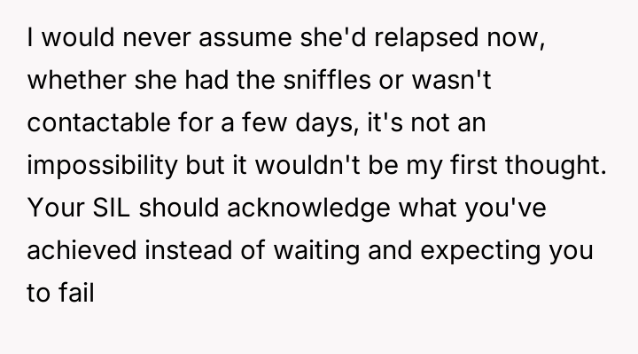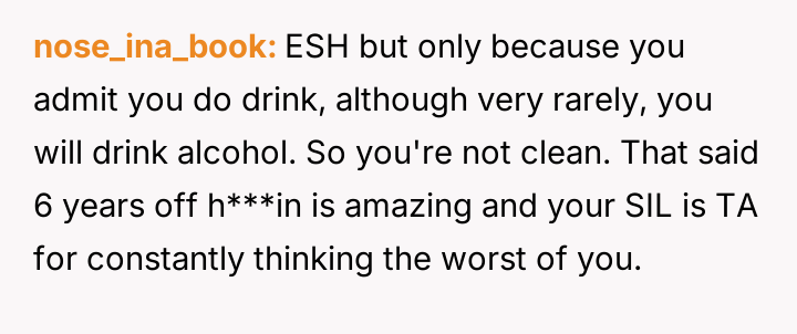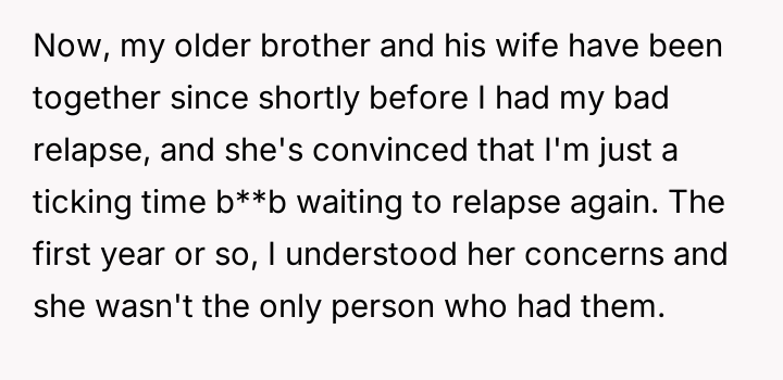 The original poster (OP) is struggling because, despite achieving nearly six years of sobriety from h***in, his sister-in-law consistently distrusts him, leading to public accusations and creating intense family tension.