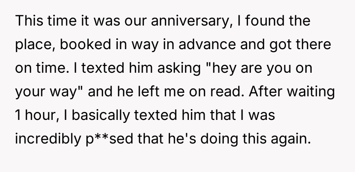The original poster (OP) feels disrespected and frustrated because her partner consistently shows a lack of consideration for her time, especially during important occasions like their anniversary, despite her efforts to be patient due to his acknowledged mental health struggles.