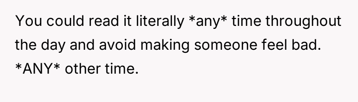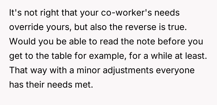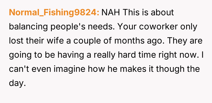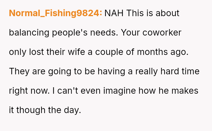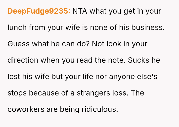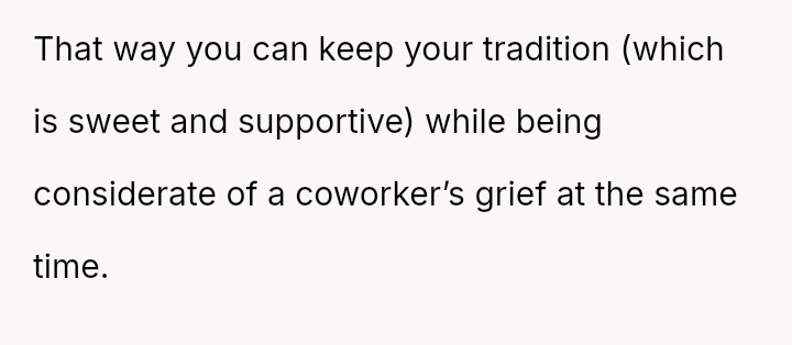 Should the OP prioritize his personal, es**blished source of emotional support and his right to express his relationship dynamic openly at work, or does the profound grief of a coworker create an ethical obligation to adjust his behavior, even if it means sacrificing a valued ritual?