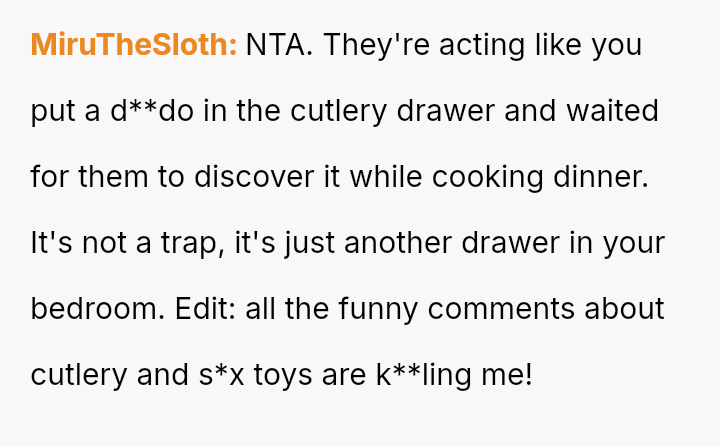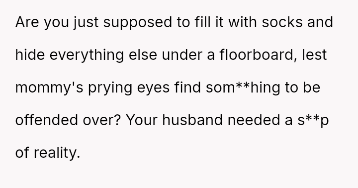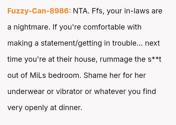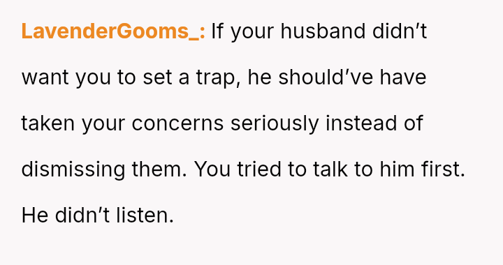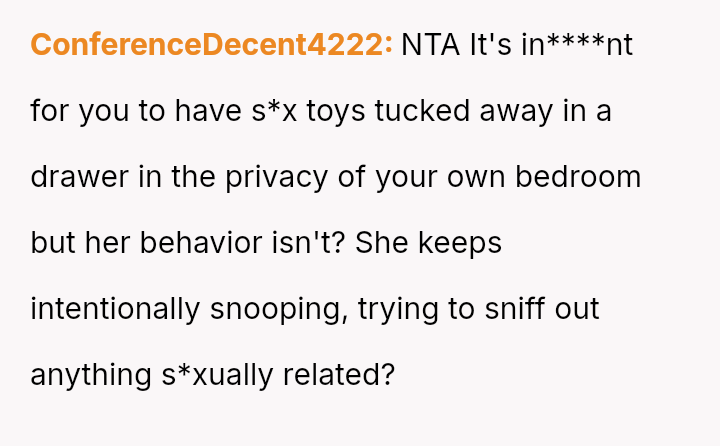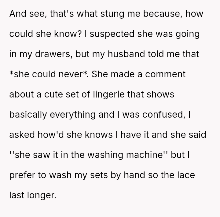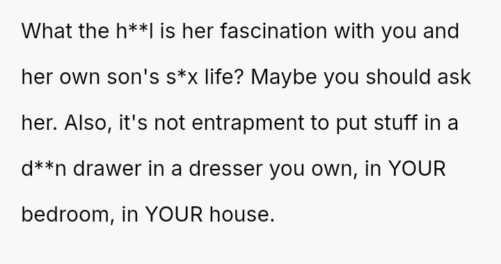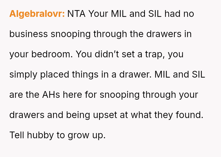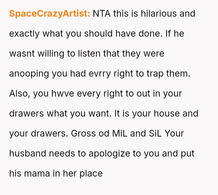 The original poster (OP) felt justified in setting a trap to confirm sus**cions that her mother-in-law (MIL) was invading her privacy regarding personal and intimate items.