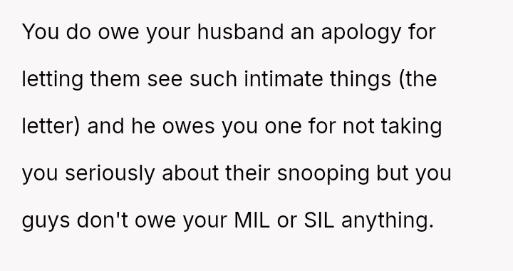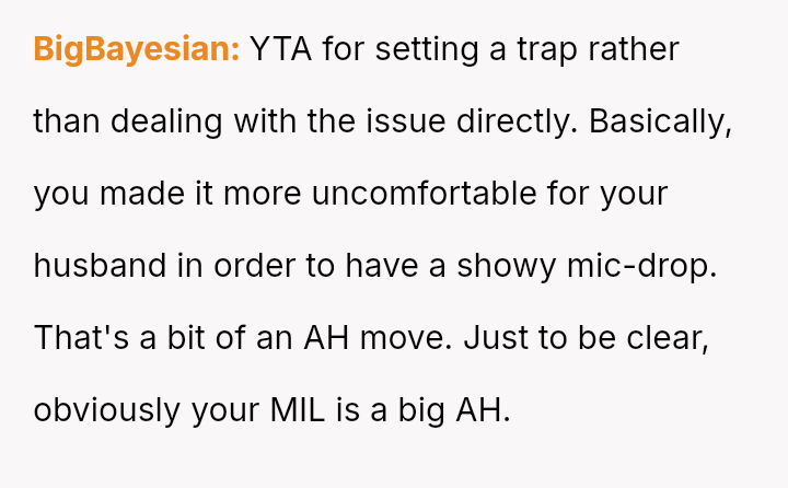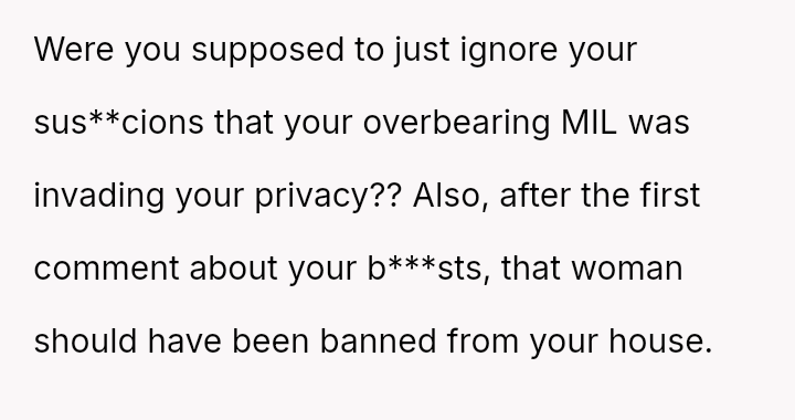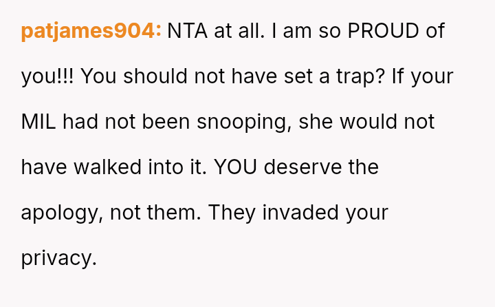 Given the confirmed invasion of privacy versus the intentional staging of the discovery, the central question remains: Was setting a deliberate trap to expose the MIL's snooping an acceptable m**hod to address the continuous boundary v***ations, or did this approach unfairly escalate the situation and damage trust within the immediate family?