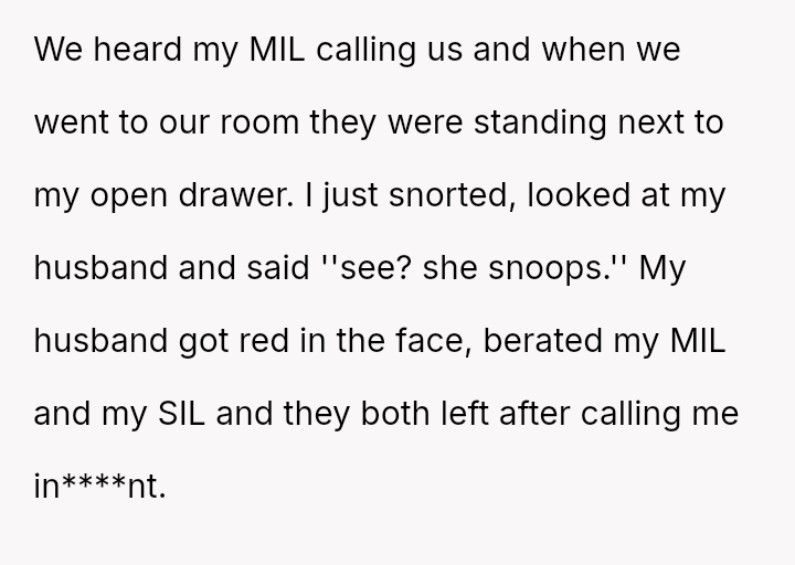 This action, while potentially confirming the MIL's snooping, led to immediate conflict with both the MIL/SIL and the husband, who is upset about the confrontation setup.