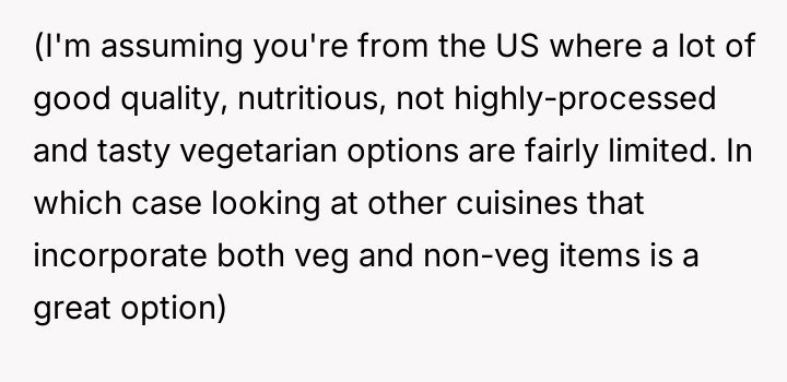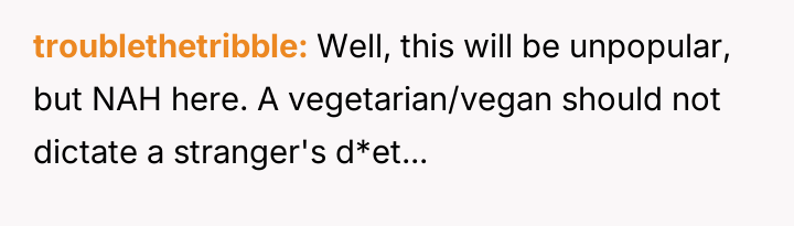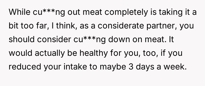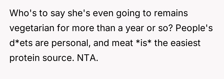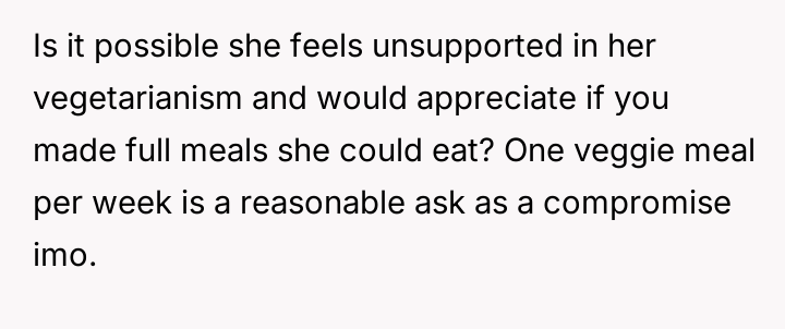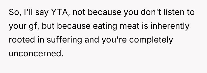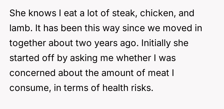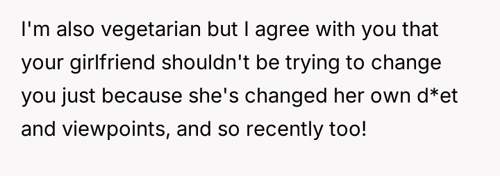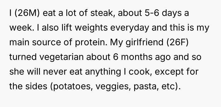 The original poster feels frustrated because his girlfriend is trying to impose her new vegetarian beliefs onto his long-standing d*etary habits, leading to conflict despite his efforts not to interfere with her choices.