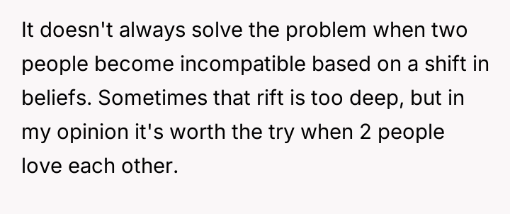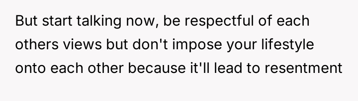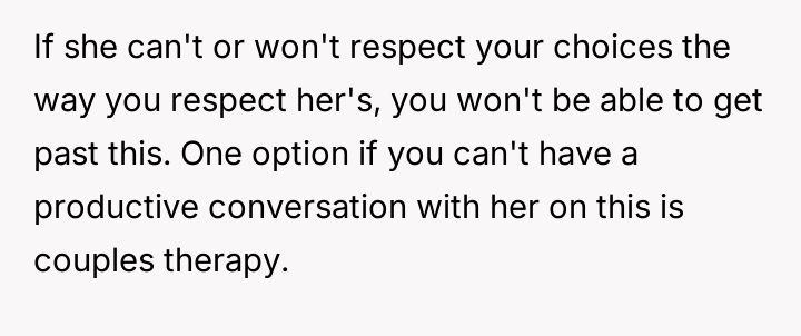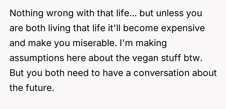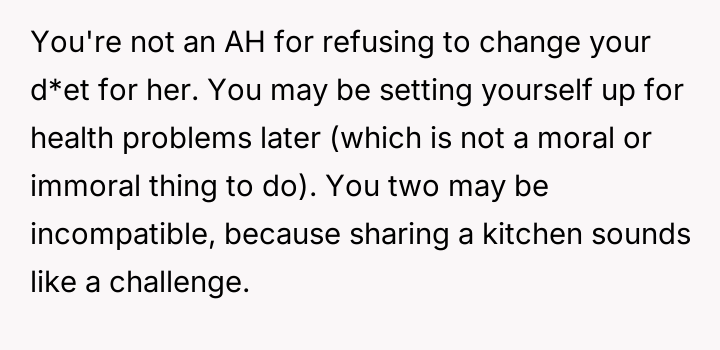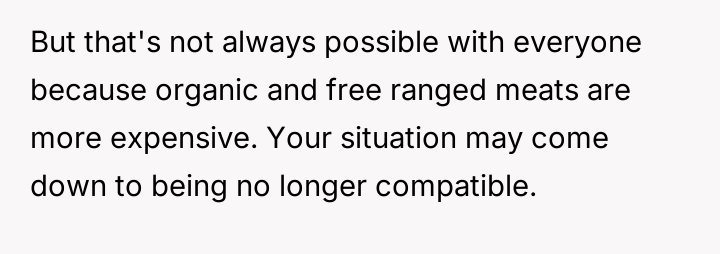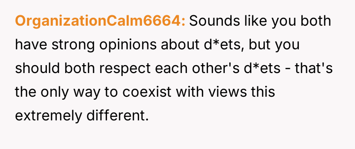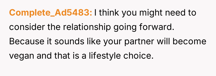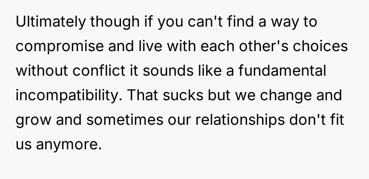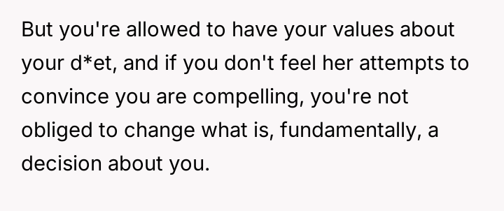 Is it acceptable for a partner to pressure the other to drastically change fundamental lifestyle habits, such as d*et, based on their own moral or ethical shifts, or must each partner maintain complete autonomy over their personal choices within the relationship?