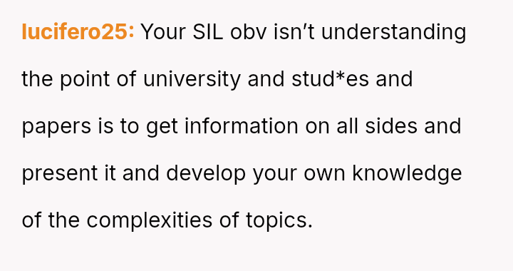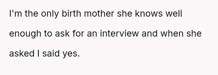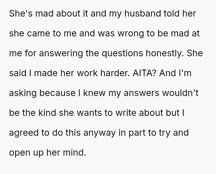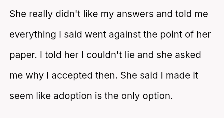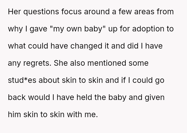 The SIL asked the poster for an interview for her a*signment, centering questions on regrets, the decision to place the child, and the impact of post-birth contact like skin-to-skin bonding, leading the poster to question if she was wrong to be honest when the answers conflicted with the SIL's expected narrative.