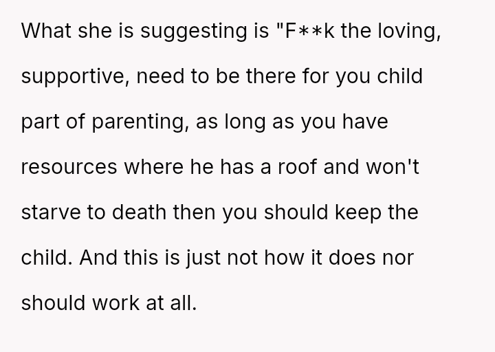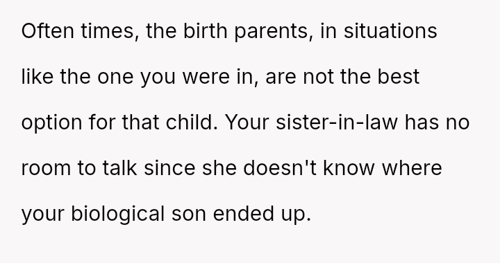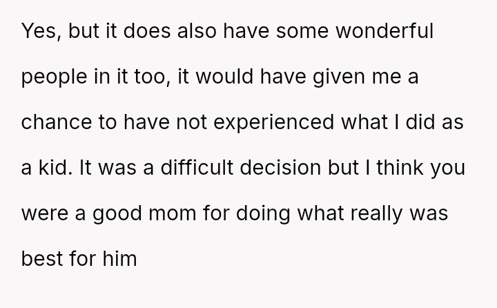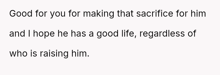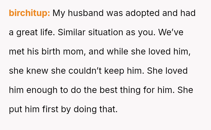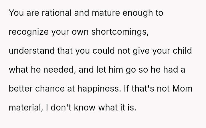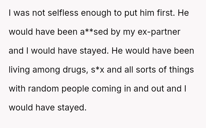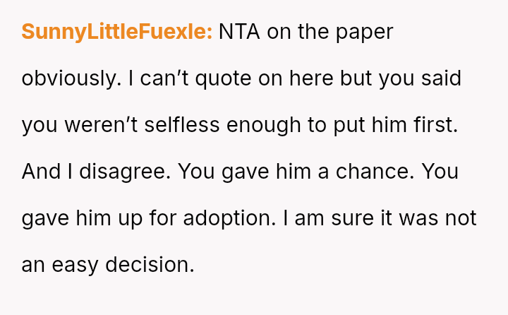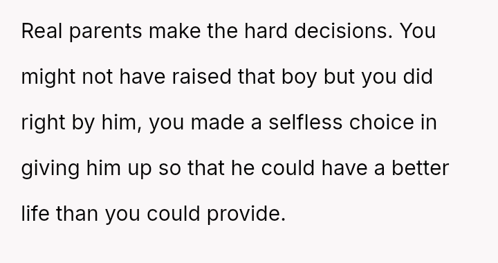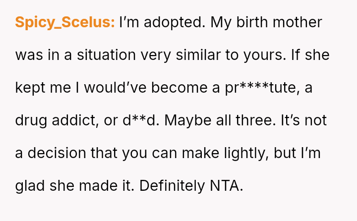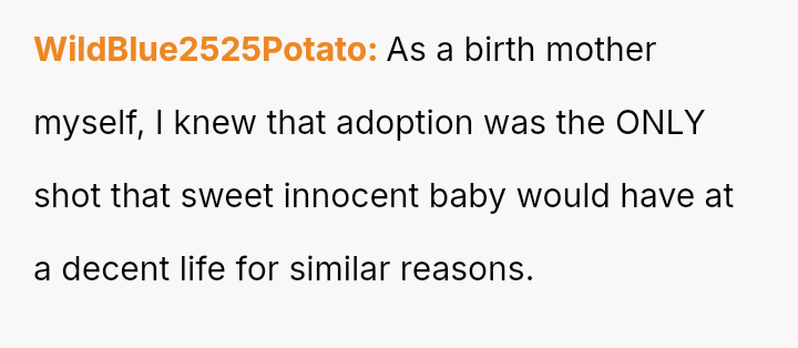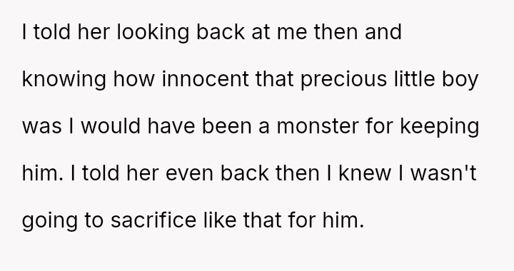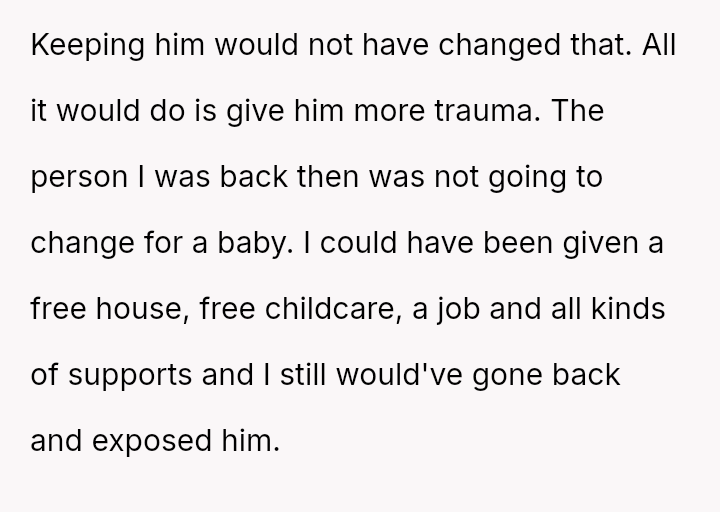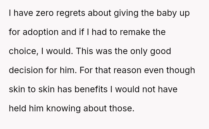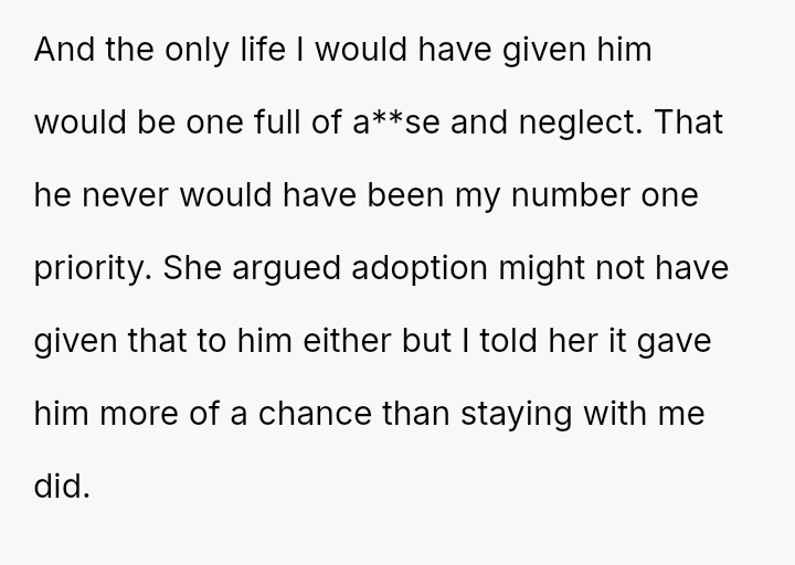 The central conflict stems from the poster's firm conviction that placing her child for adoption was the only way to ensure his safety from the abusive environment she was living in at 20.