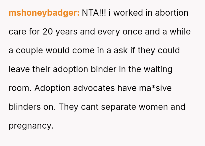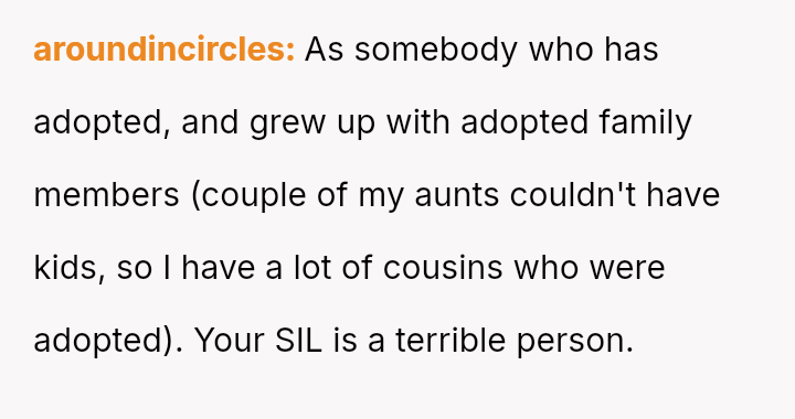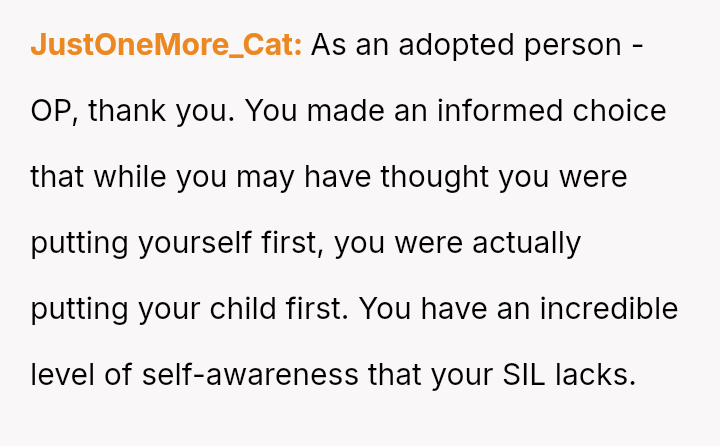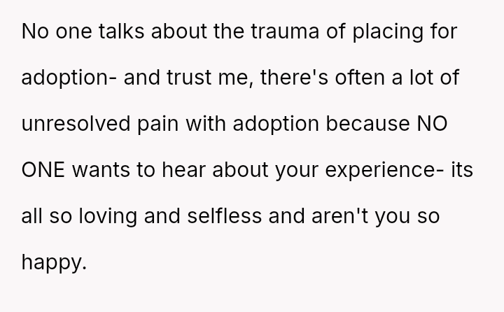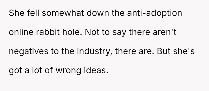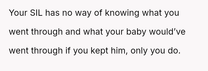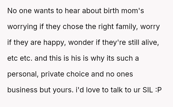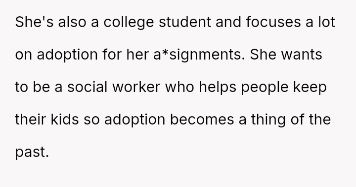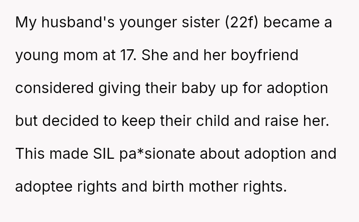 The poster's younger sister-in-law (SIL), who became a young mother herself at 17 and chose to raise her child, developed a strong interest in adoption, focusing heavily on anti-adoption literature for her social work stud*es.