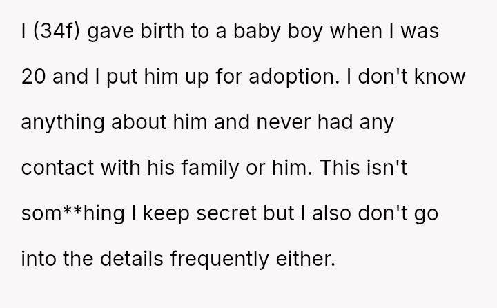 The poster, a 34-year-old woman, placed her son for adoption at the age of 20. She has had no contact with the child or his adoptive family since the placement. This personal history is not a secret but is not frequently discussed.