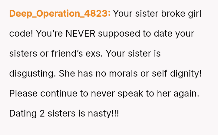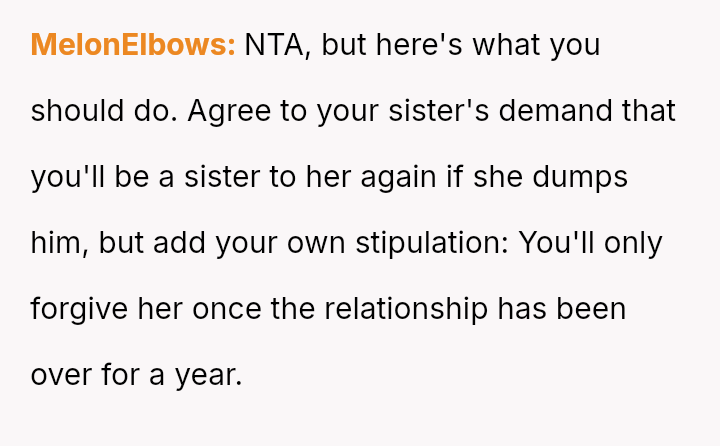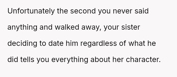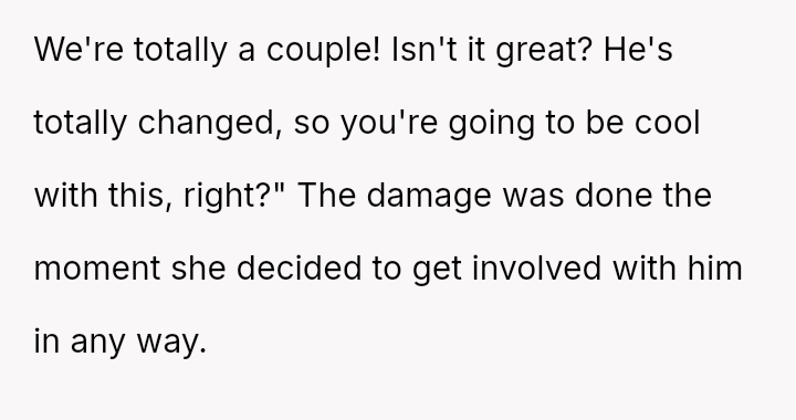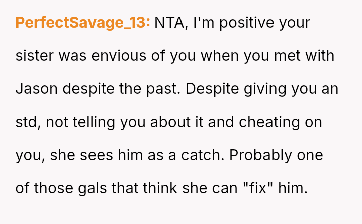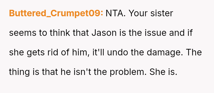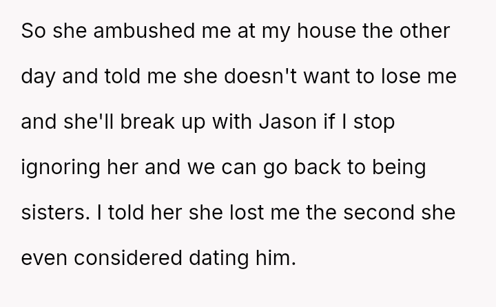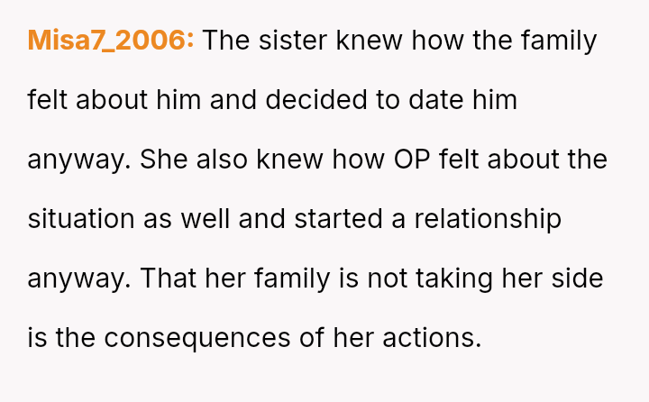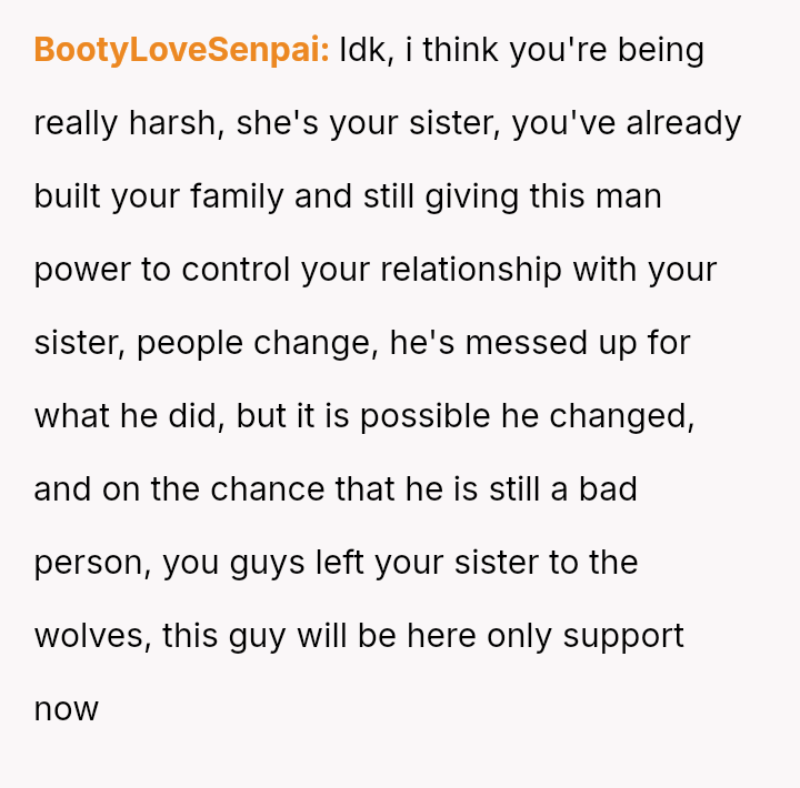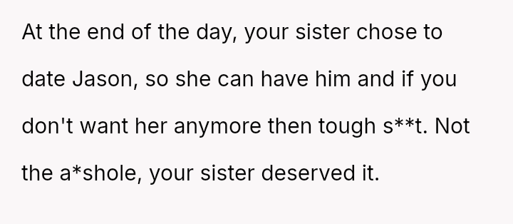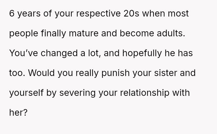 After moving on and marrying someone else, the OP's sister (27F) recently asked for her blessing to date Jason, claiming he had changed, which resulted in the OP completely cu***ng off contact.