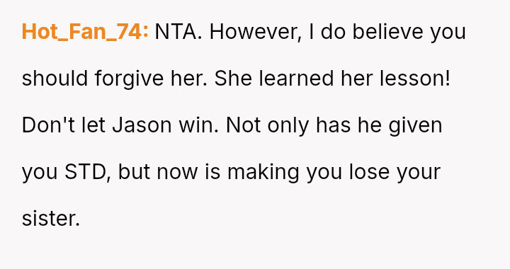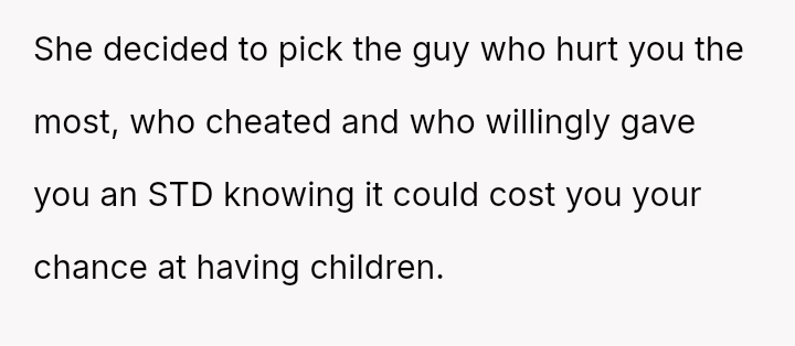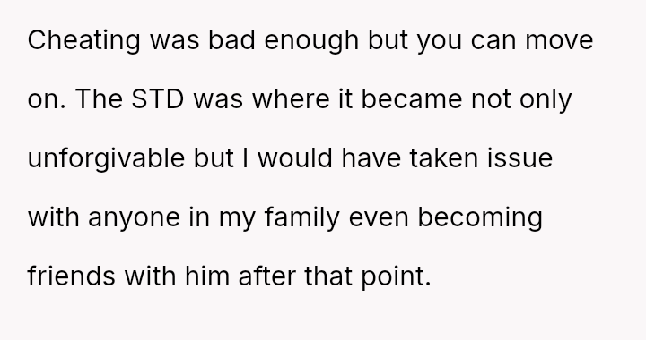 While the cheating was difficult to move past, the failure to disclose the STD made the betrayal unforgivable, leading the original poster (OP) to feel that anyone in her family should not even be friends with him.